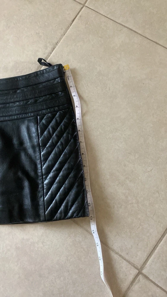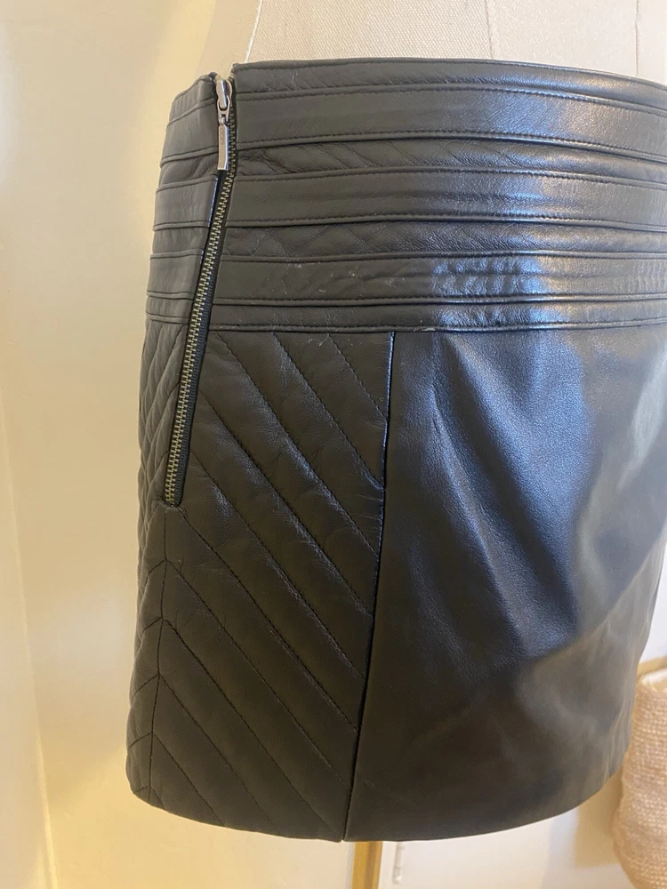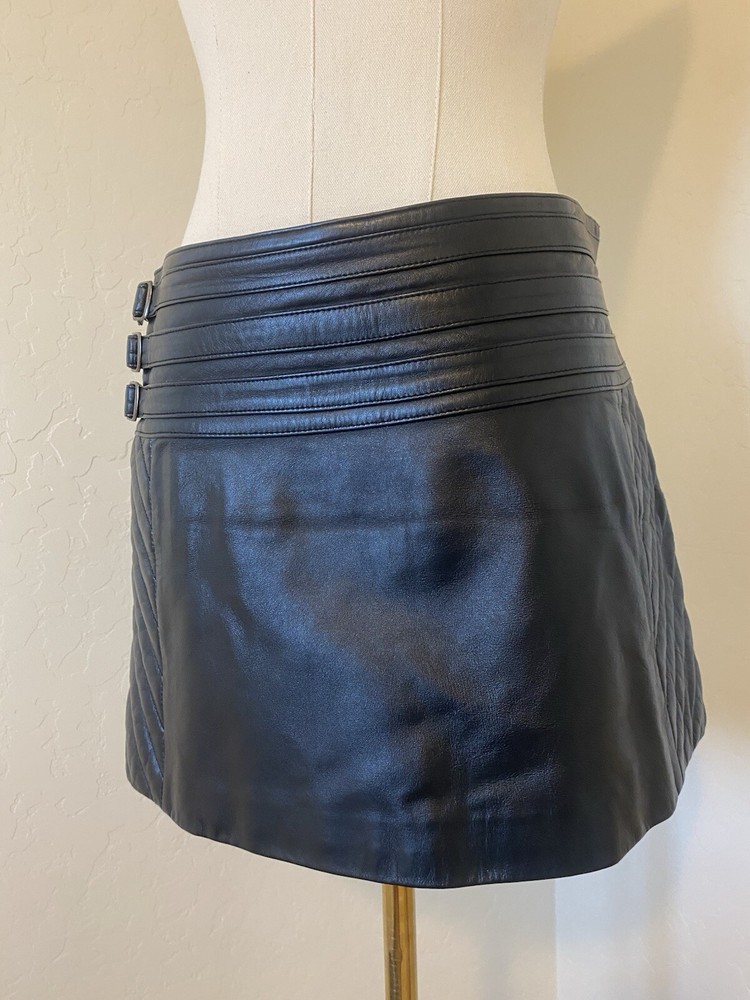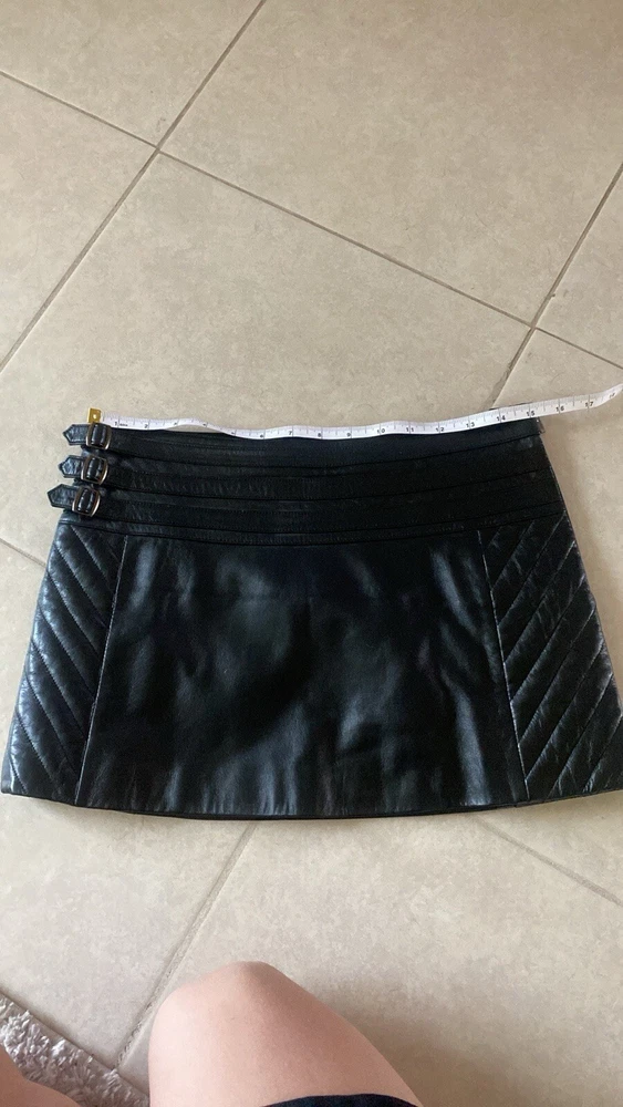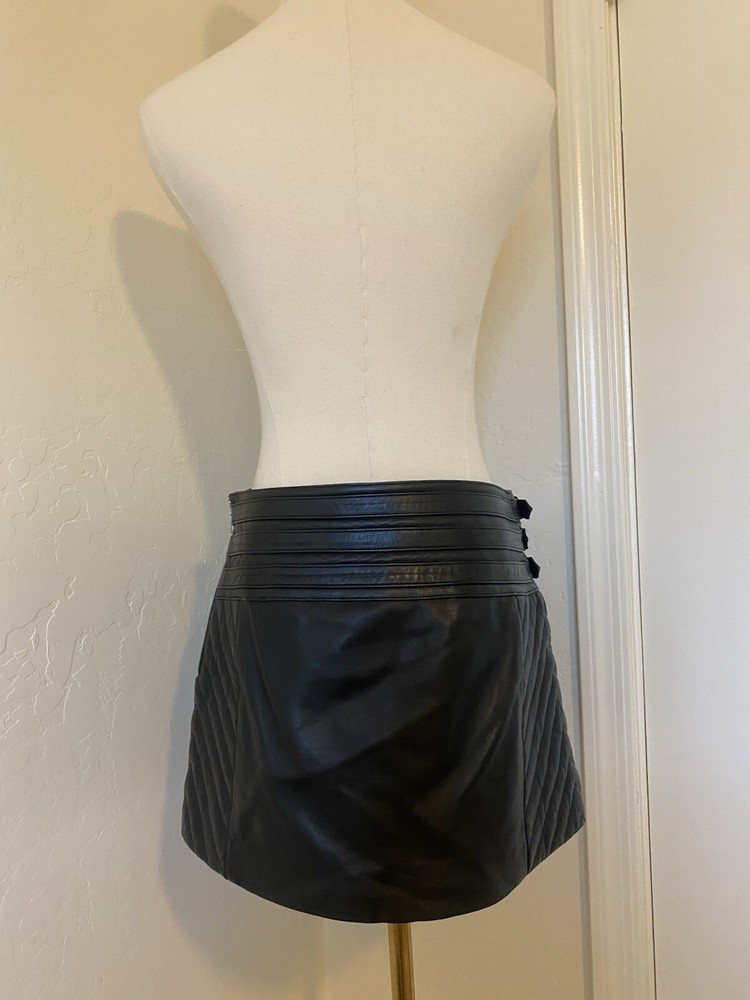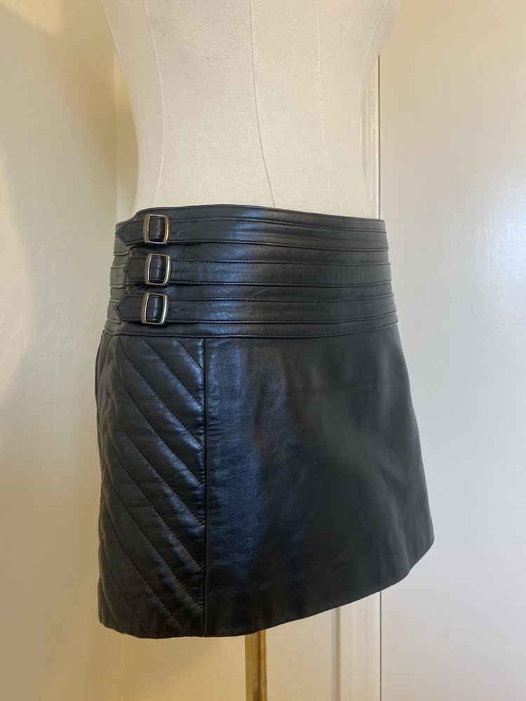 Chic and stylish black leather mini skirt with buckle details. Quilted sides. Side zip closure. So trendy, would have been perfect for Brat summer/tour. Charli XCX early 2000s vibes. In perfect condition. Tagged a size 6, but I’d say it fits much closer to a size 4. Length approx 13” Waist approx 15” 2000s punk brat Charli XCX