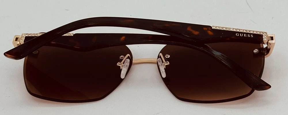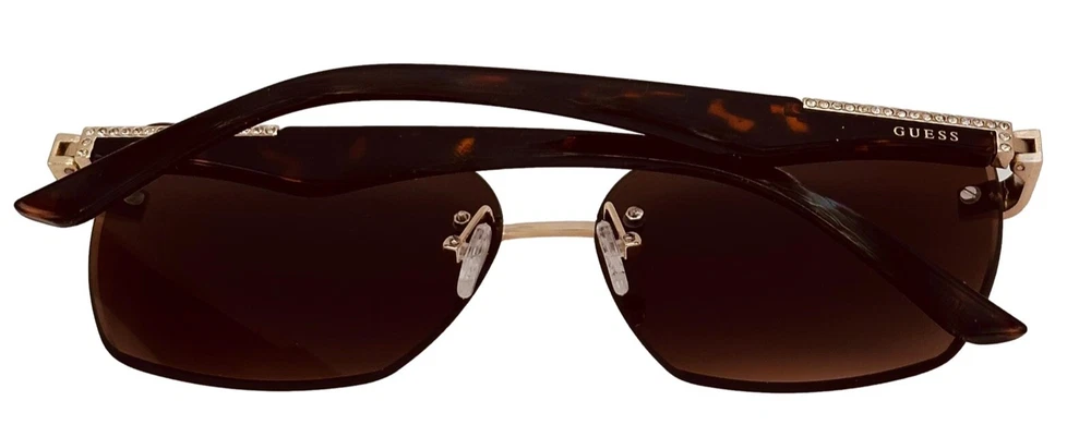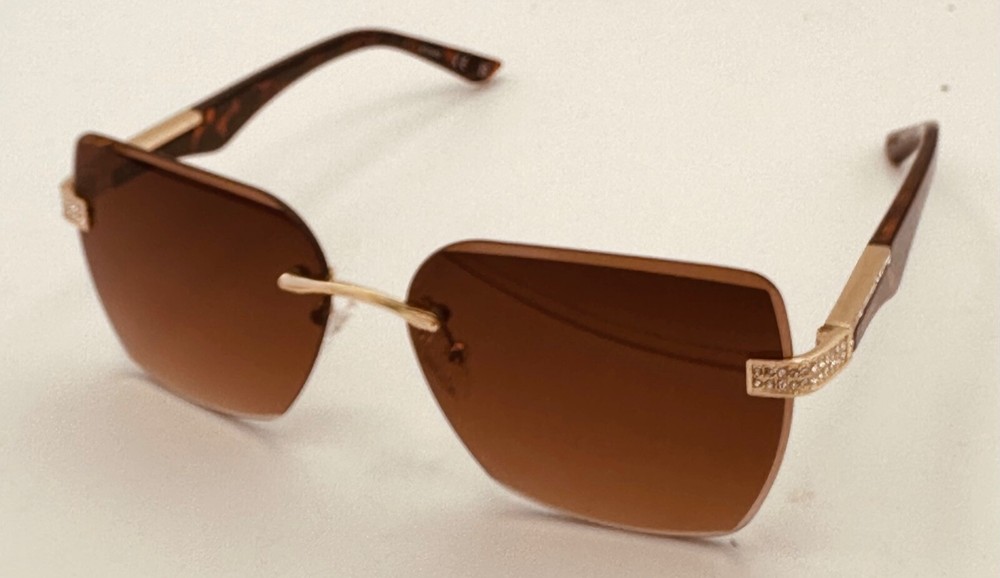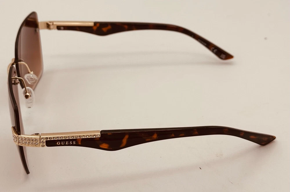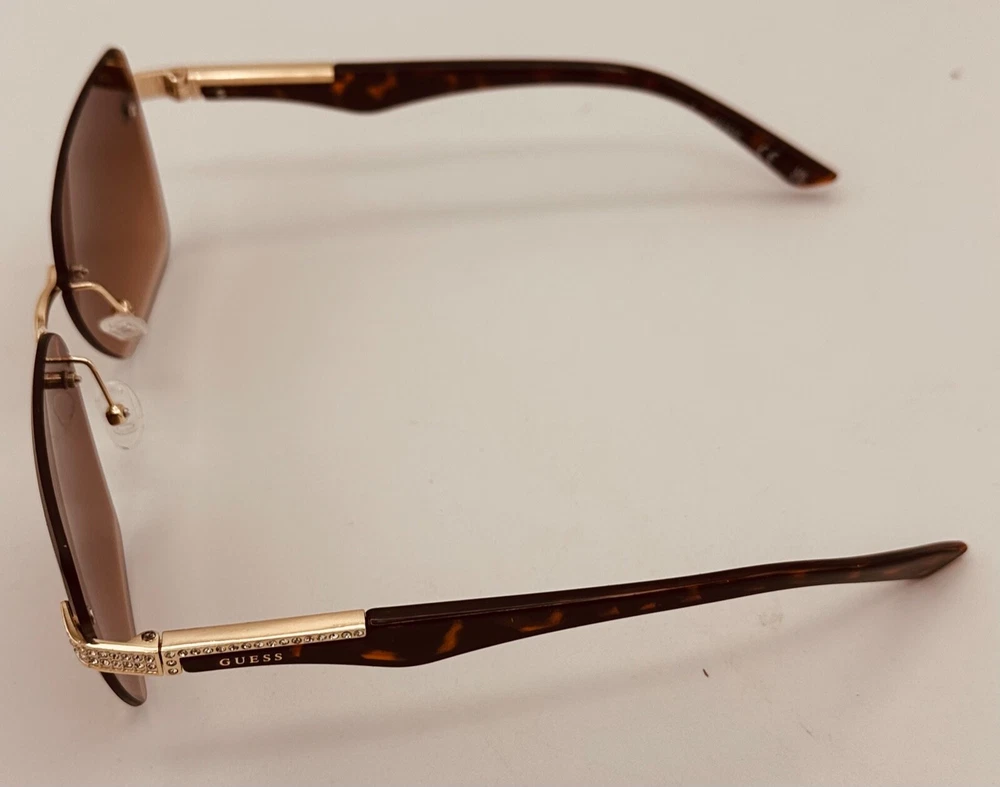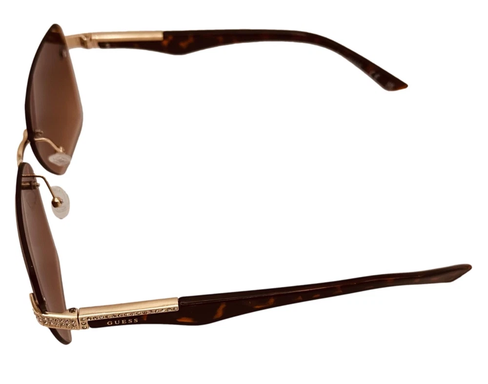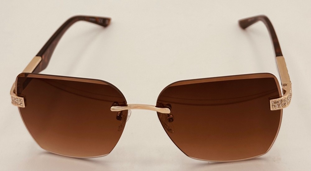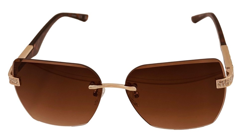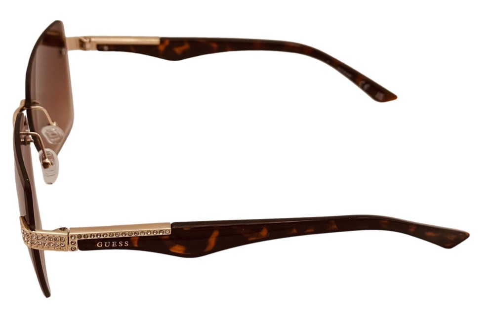 Elevate your style with these Guess sunglasses for women. The gold oversized square rimless sunglass paired with brown gradient lenses creates a sleek and modern look. These sunglasses feature 100% UV protection and plastic lenses with brown gradient vision technology. The frame is made of durable metal and is designed to last. Perfect for any occasion, these sunglasses are a great addition to any outfit. The designer and metal theme adds a touch of sophistication to your style. Made in China, these sunglasses are a must-have for any fashion-forward person. Size: 60. 13. 145 , Height 48mm, Regular Retail: $75.00 You Pay: $29.99
