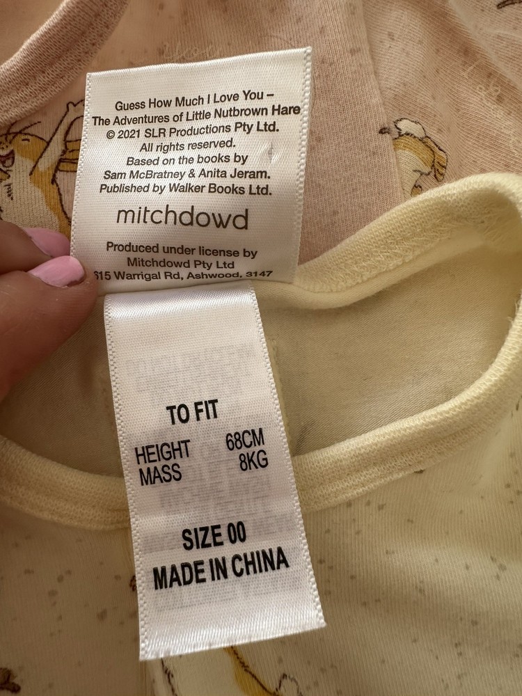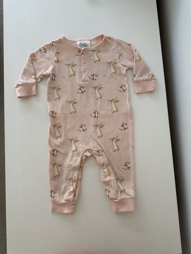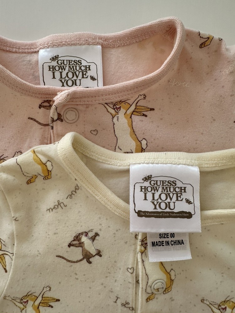 Guess how much I love you, nut brown hair bunny print - Set of 2 rompers in peach and sorbet yellow - size 3- 6 M - 100% cotton