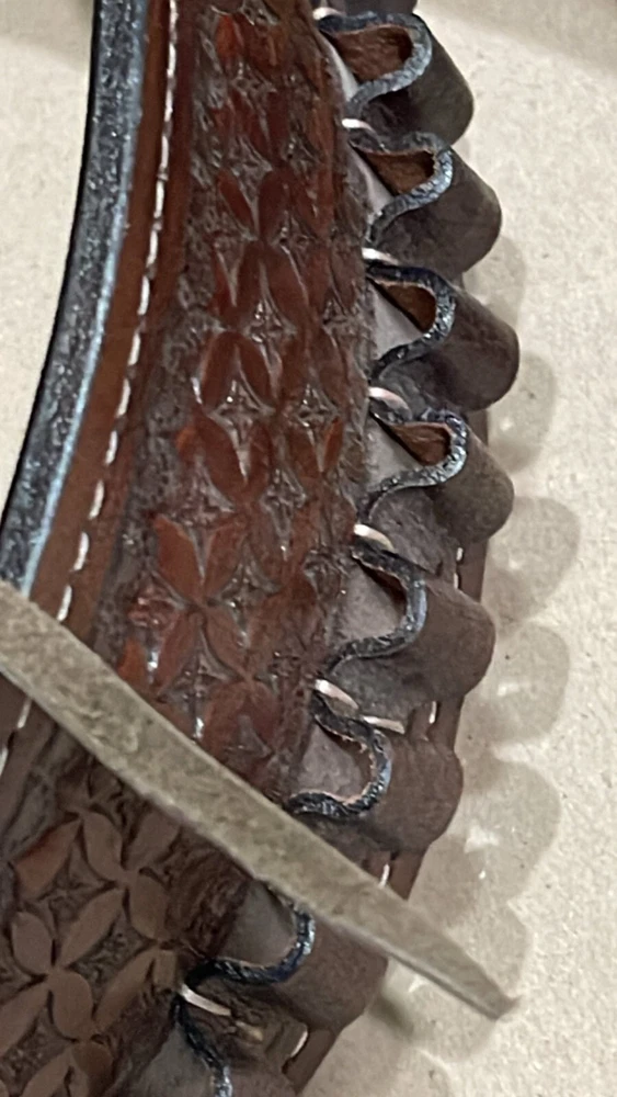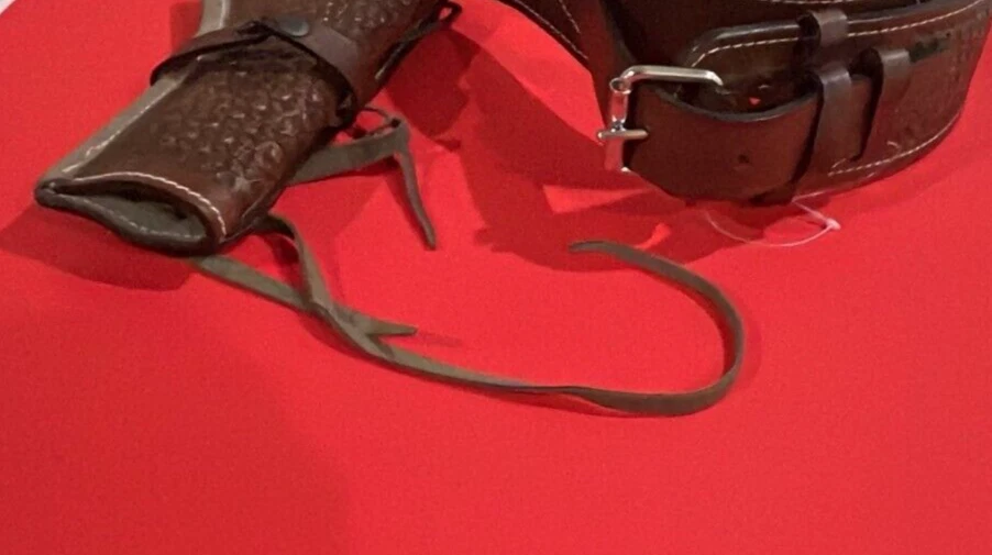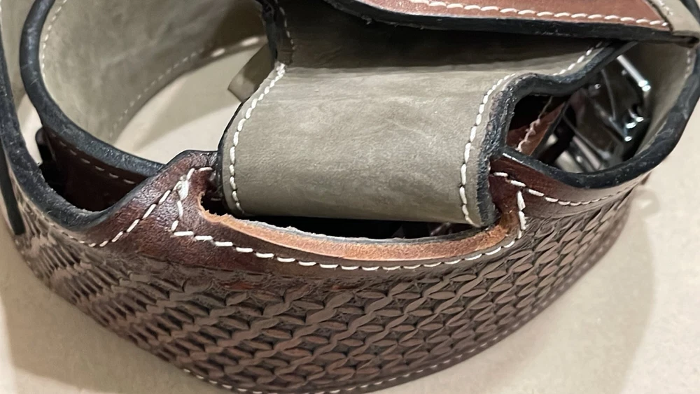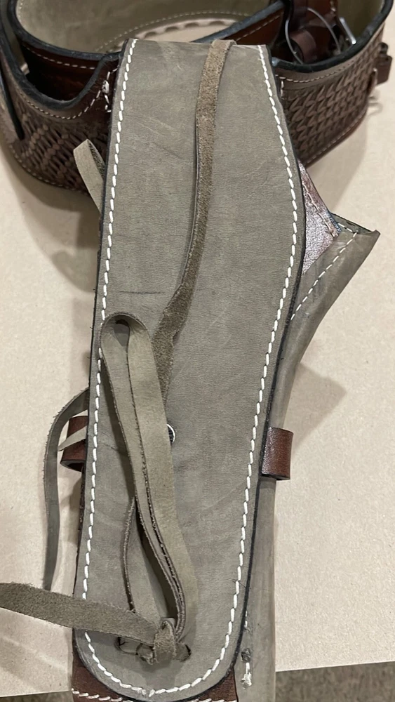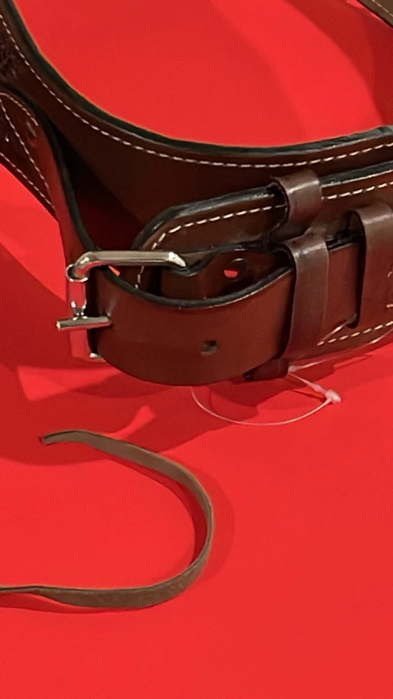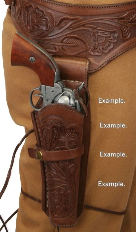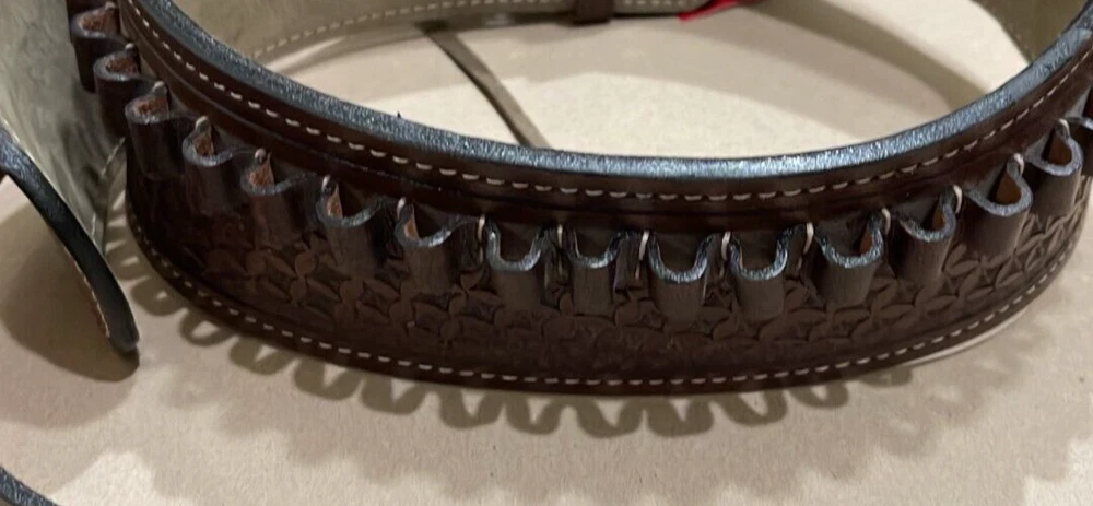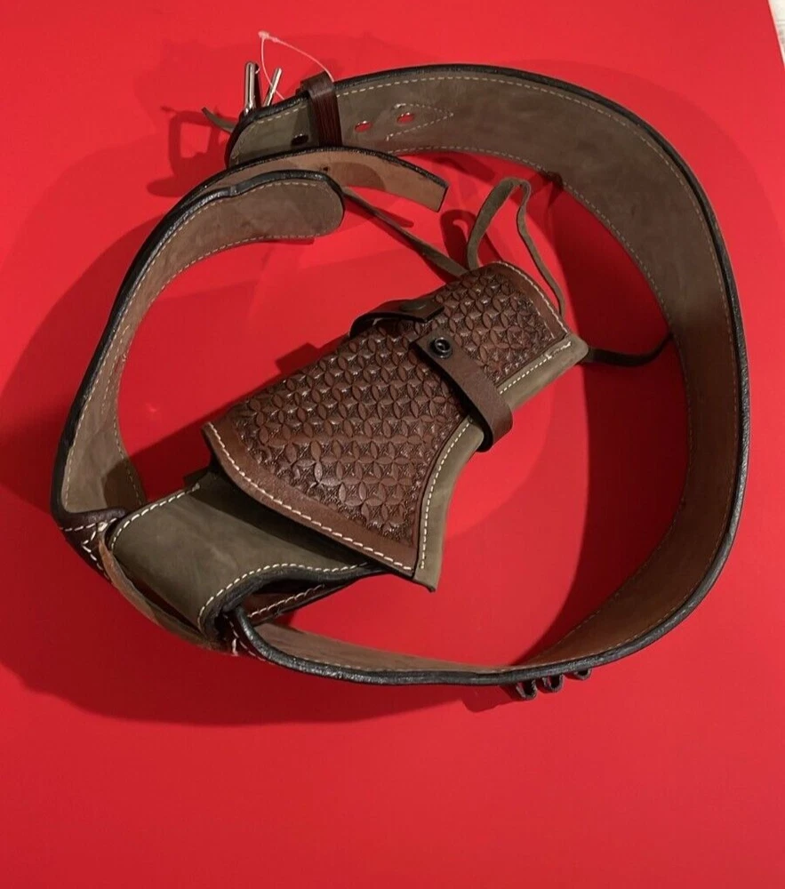 These distinctive leather pistol holster belts are ideal for daily use, hunting, ranch work, or add to your collection. Premium, real, hand-tooled leather is used to make these belts, which are crafted for a smooth draw and easy re-holstering. An incredibly stunning and amazing piece. Size 38"-40"