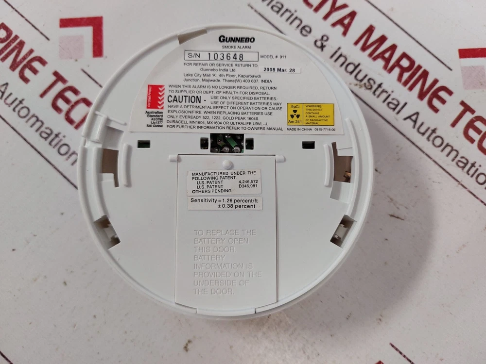 Aeliya Marine Tech Private Limited 100% Genuine Products | Free Shipping | 30 Days Return Policy *You are only buying what you see in photos* ----------------------------------------------------------------------------------------------------- Gunnebo smoke alarm 911 (without battery) gunnebo india ltd. smoke alarm model: 911 smoke alarms for minimum protection 0915-7716-00 sensitivity = 1.26 percent/ft ± 0.38 percent made in china weight: 175 gm Qref : 997 ref no: 63128 Taxes & import duties Destination country all taxes & duty to be paid by buyer.[not included in price]. Payment Paypal for air/courier shipment. T/T option available for the large items above 300 Lbs. Packing Quality packing for each product. Assured safe and undamaged delivery. Shipping Free Shipping on all products except heavy items. FedEx Express, DHL Express International Shipping. Shipping through sea available for large order. RETURN POLICY Returns accepted within 30 days. Duty charges and Shipping charges will be borne/pay by the Buyer. Restocking Fees will be 20%. Please check the listing properly as returns are not accepted in only for parts products. About us We are one of the leading stockiest and exporter of marine & industrial equipment. Our motto is customer satisfaction. Please Contact us for your feedback.