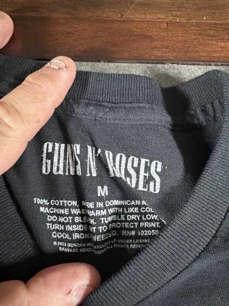 The Guns N' Roses T-Shirt for men in size M features a graphic print of the iconic band logo and skull design, embodying the theme of "Appetite For Destruction." Made of breathable cotton material in a classic black color, this short-sleeve tee with a crew neckline is perfect for any season. The vintage-inspired shirt from the renowned Guns N' Roses brand offers a regular fit and is machine washable, making it a must-have for fans of the band and collectors of unique designer tees.