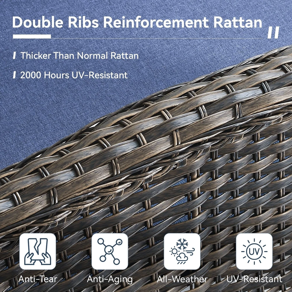 Chair Color:Black Rattan Color: Brown & Yellow; Grey Cushion Color: Beige color, Blue color Chair Dimensions:28.5"D x 31"W x 35"H Table Dimensions: 19.7"D x 19.7"W x 19.7"H Style:Modern Special Feature:Swivel, Arm, Cushion AvailabilityAbout this item Rocking and 360 degree swivel: Relax and enjoy sitting on your front or back porch in ultimate comfort with rocking/ glider feature allowing for backward and forwards motion while also being able to swivel 360 degree to change direction. Glass Table Top:The top of the coffee table is equipped with transparent glass, whether you are enjoying a cup of coffee alone on the front porch or indulging yourself with families or friends in an evening drink on your back terrace, you will do so in comfort and style. Handwork Material: This Free Shipping Over $49.99* Details Gymojoy Swivel Patio Chair & Table 3 Piece Outdoor Furniture Set Product Description: Chair Color:Black Rattan ColorBrown & Yellow; Grey Cushion ColorBeige color, Blue color Chair Dimensions:28.5"D x 31"W x 35"H Table Dimensions 19.7"D x 19.7"W x 19.7"H Style:Modern Special Feature:Swivel, Arm, Cushion Availability About this item Rocking and 360 degree swivelRelax and enjoy sitting on your front or back porch in ultimate comfort with rocking/ glider feature allowing for backward and forwards motion while also being able to swivel 360 degree to change direction. Glass Table Top:The top of the coffee table is equipped with transparent glass, whether you are enjoying a cup of coffee alone on the front porch or indulging yourself with families or friends in an evening drink on your back terrace, you will do so in comfort and style. Handwork MaterialThis wicker patio chairs have high quality rustproof galvanized strong steel frame, durable and not break easily; waterproof PE rattan wicker and Water Resistant cushions, Suitable for all weather ,outdoor and indoor. UV Resistant; Weather Resistant; Water Resistant. Stable and breakage-proof tempered glass table top. Assembly and MaintenancePatio chairs set of 2 is easy to install with all the instructions and hardware included. Maintenance free set which is suitable for balcony, deck, backyard, patio, garden, poolside, etc. Packing List: 2× Chair 2× Seat Cushion 2× Back Cushion 1x Coffee Table 1x Instructions and all necessary hardware