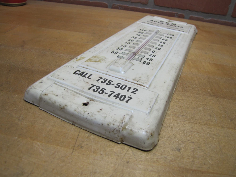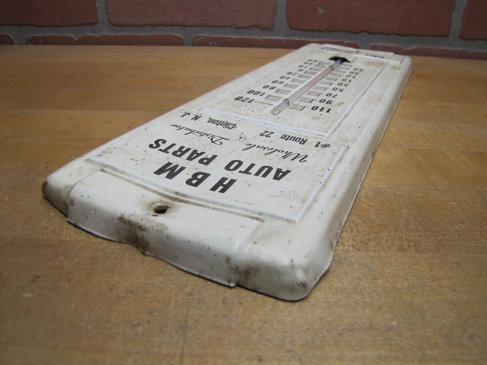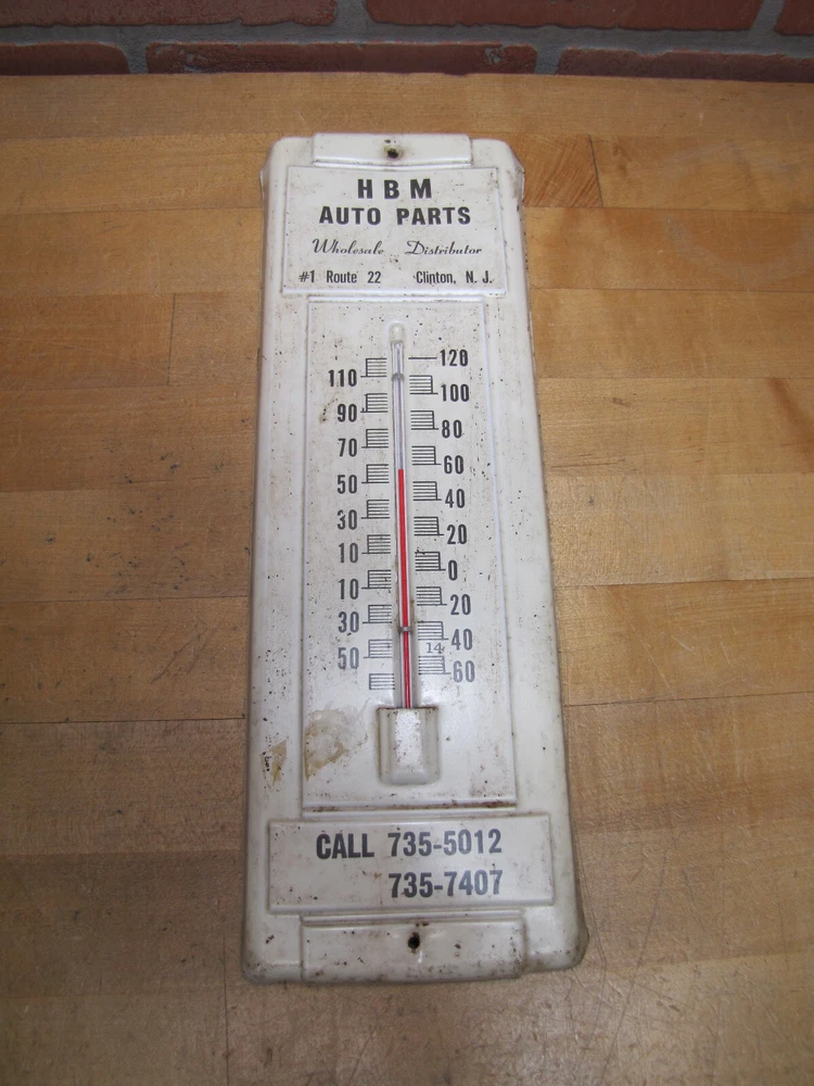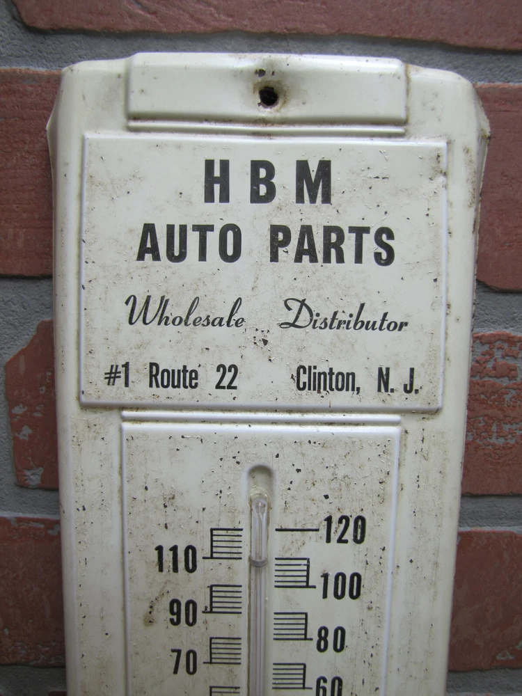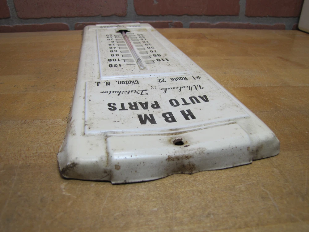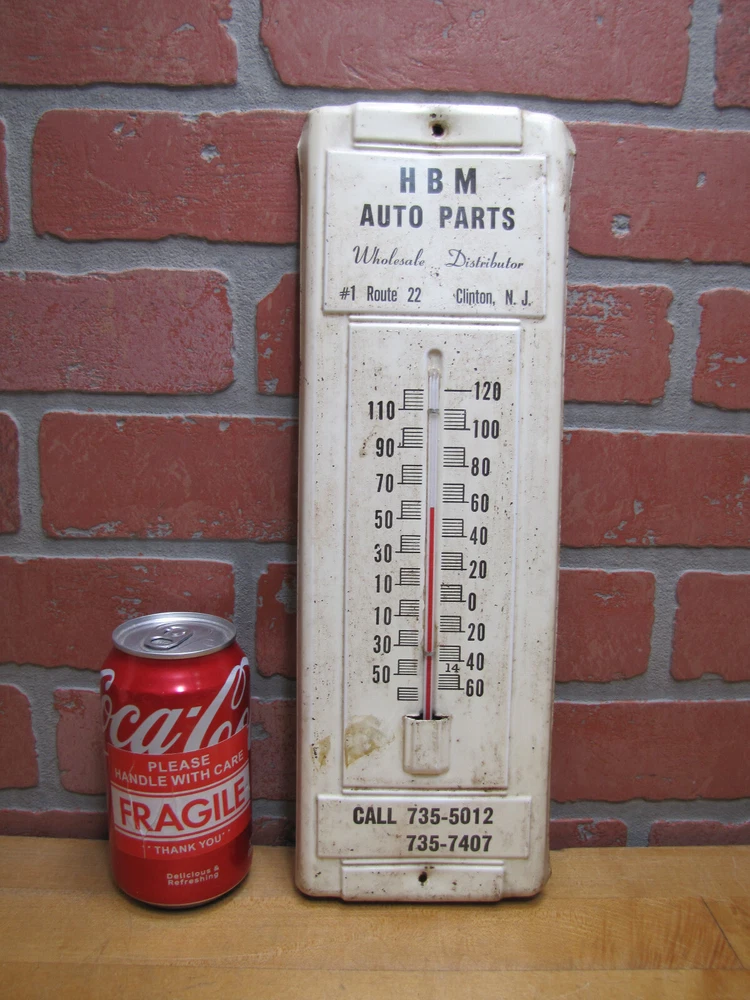 H B M AUTO PARTS CLINTON NJ. ORIGINAL OLD ADVERTISING SIGN THERMOMETER. GAS OIL ADVERTISING STORE DISPLAY. MEASURES APPROX 4 1/2" X 14". SHOWING WEAR AND TEAR WITH AGE AND USE THROUGHOUT. VIEW ALL PHOTOS FOR ADDITIONAL INFORMATION AND TO JUDGE CONDITION FOR YOURSELF. DIRTY AS ACQUIRED. WORN USED CONDITION. THERMOMETER UNTESTED FOR ACCURACY SOLD FOR DISPLAY AS SHOWN IN PHOTOS -CG1BX2- *AGED2PERFECTIONSTORE* SAVE US TO YOUR FAVORITES - CHECK BACK OFTEN, NEW ITEMS LISTED EVERY WEEK PLEASE NOTE: SHIPPING ONLY - NO LOCAL PICK UP AVAILABLE WE COMBINE/LOWER SHIPPING AS POSSIBLE ON MULTIPLE PURCHASES - ASK OR MESSAGE US FOR A COMBINED INVOICE BEFORE PAYING, ITEMS MUST BE PAID FOR UNDER SAME INVOICE FOR DISCOUNT *AGED2PERFECTIONSTORE* FIND US AT AGED2PERFECTIONSTORE & AGED2PERFECTIONSTORE1&2