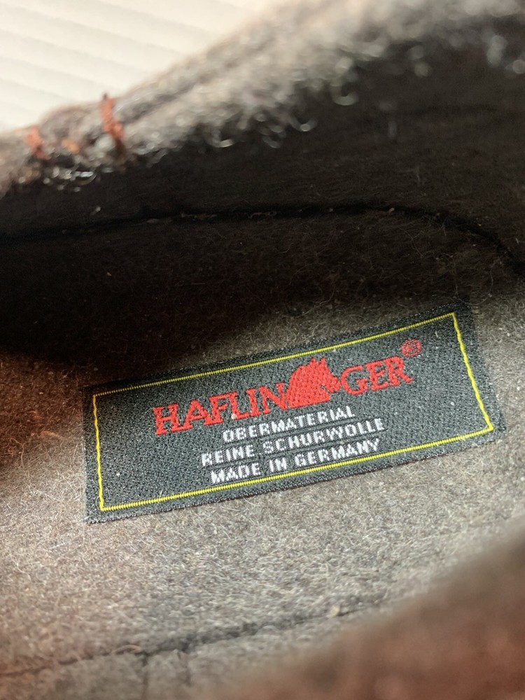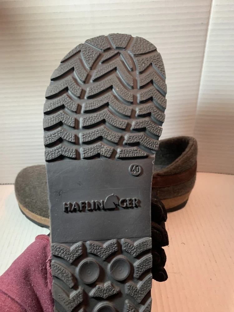 These are HAFLINGER German women's shoes in size 9, made of 100% virgin wool. They are slip-on clogs with a round toe shape and a flat heel style. The upper material is wool and the lining and insole materials are also wool. The outsole is made of suede. These shoes are designed for comfort and support, with arch support and a non-slip sole. They are suitable for travel, casual wear, and workwear. The shoes have a classic design and are available in brown blend.