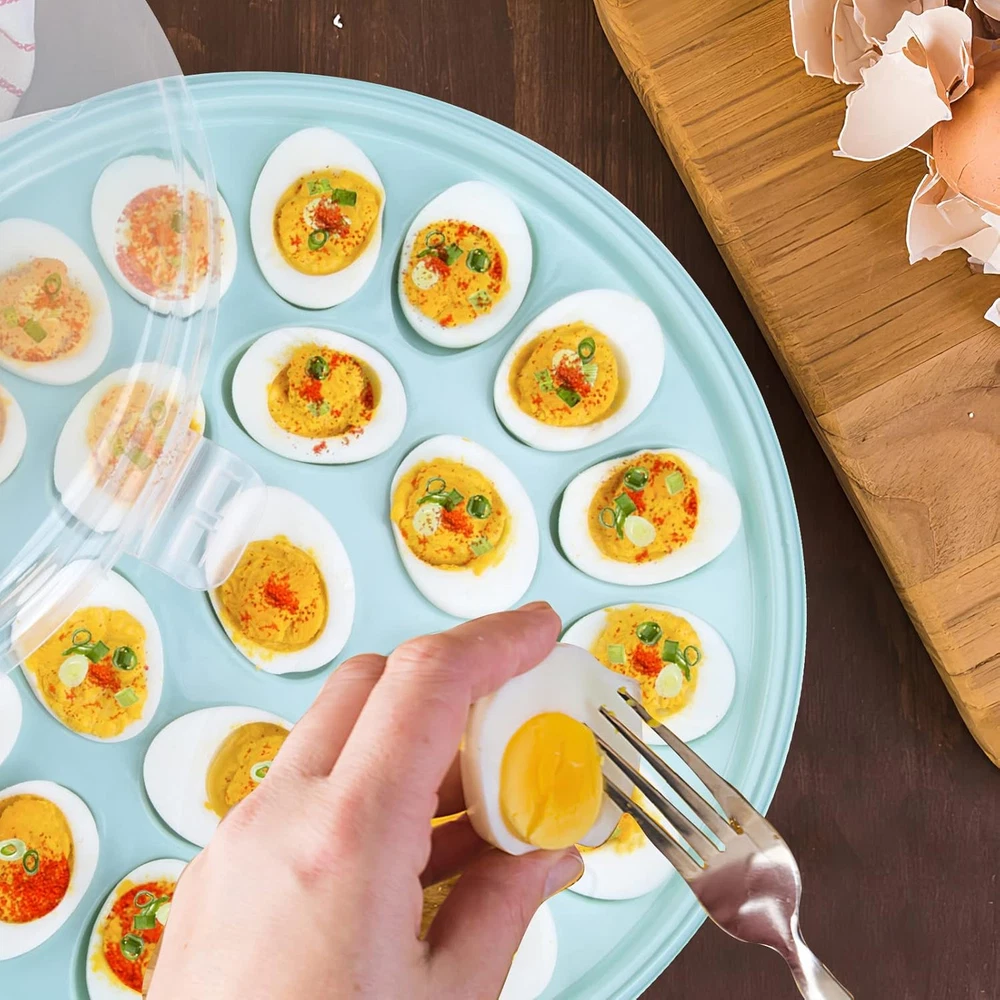 Store New Arrivals Add to Favorite View Feedback Contact HAKSEN Deviled Egg Containers with Lid,3Pcs Blue Deviled Egg Platter, Deviled Egg Carrier with 66 Slots for Holidays Parties Home Kitchen Description Item model number HPOP0403 Style 1PCS Closure Type Snap Number of Sets 1 Is Microwaveable No Unit Count 1.0 Count Product Dimensions 12"L x 12"W x 2.7"H Material Plastic Item Form Round Container Shape Round Material Type Free Likely includes some materials from the following: ['BPA Free', 'Latex Free', 'Lead Free', 'Petroleum Free', 'Nitrosamine Free', 'PVC Free', 'Phthalate Free'] Item Package Quantity 1 Lid Material Food-grade Plastic Is Dishwasher Safe No Item Weight 9.9 ounces Material Feature Food Grade Special Feature Foldable,Large Capacity,Sturdy Color blue Specific Uses For Product Deviled Egg Recommended Uses For Product Deviled Egg Manufacturer HAKSEN Brand HAKSEN Product Care Instructions Wipe with Dry Cloth Size medium FOLDABLE HANDLE & SNAP LID DESIGN - Our teal color egg carrier is designed to be easy to use and carry. The small handle and snap-fasteners keep the eggs inside fresh and clean, while the lid with snap provides extra protection, avoiding dust and water. The handle is foldable, high-strength and sturdy. CREATIVE ROUND EGG CONTAINER - The unique 12 Inch round shape of our egg platter not only looks great, but it also has a large capacity that can hold up to 22 eggs, with plenty of space between the lid and bottom for all kinds of eggs or deviled eggs. And because it's round, it takes up less space in your fridge or pantry than traditional egg cartons. SAFE & DURABLE - Our egg container is made from food-grade PP that is non-toxic, odorless, sturdy, and water-resistant. This egg box has passed rigorous testing and certification processes, so you can be sure that it is 100% safe to use. PERFECT FOR DEVILED EGG - Our egg carrier is not just for regular eggs, more importantly, this egg platter is perfect for deviled eggs! The solid white bottom is firm and steady, making it easy to hold your delicious deviled eggs to parties or events. And because this egg box is stackable, you can easily store the egg holder in your fridge or pantry until you're ready to serve. WHAT YOU GET - 1PC Teal Round Egg Holder with Lid (22-cavity, for 2" long egg, foldable handle, snap lock, stackable, 12" in diameter), perfect for camping, Easter party, deviled egg containing. Product Description The video showcases the product in use. The video guides you through product setup. The video compares multiple products. The video shows the product being unpacked. Teal Round Egg Holder Add to Cart Add to Cart Add to Cart Add to Cart Add to Cart Add to Cart Add to Cart Customer Reviews 3.7 out of 5 stars 746 4.6 out of 5 stars 2,317 4.6 out of 5 stars 2,317 4.1 out of 5 stars 2,266 3.8 out of 5 stars 4,381 4.6 out of 5 stars 290 4.3 out of 5 stars 541 Price $14.99 $ 14 . 99 $6.99 $ 6 . 99 $9.99 $ 9 . 99 $7.99 $ 7 . 99 $6.49 $ 6 . 49 $7.99 $ 7 . 99 $8.49 $ 8 . 49 Qty. 1pc 36pcs 108pcs 10pcs 12pcs 6pcs 1pc Size 12in 6.5", 8.5", 10.5" 6.5", 8.5", 10.5" 16in 12in 6" 22" x 29" Material PP paper paper wood, metal wood, metal wood fabric Odorless ✔ ✔ ✔ ✔ ✔ ✔ ✔ Exchangeable/Returnable ✔ ✔ ✔ ✔ ✔ ✔ ✔ How many snap locks on the lid? Our egg holder's lid has 4 fasteners in 4 different directions. So the lid will never get loose. What's the egg box made of? Our deviled egg container is made of PP, nontoxic and odorless. How many eggs can this egg case hold? This egg carrier can hold 22pcs eggs. ABOUT US We offer the best prices around on high quality products. Our E-store includes media such as books, movies, music and games while offering electronics, toys, sporting apparel, clothing, tools, general home, garden items and more. SHIPPING We are always working hard to ensure your package arrives as soon as possible. Please understand that some factors like weather, high postal traffic, and the performance of shipping companies are outside of our control. We offer free shipping to the lower 48 states and ship within 2 business days of payment, usually sooner. We do not accept P.O. Boxes. Please provide a physical address. RETURNS We offer a 30-Day Return Policy on items which you are not completely satisfied with. You have the option for a full-refund or an exchange of the item. No returns are available on items shipped outside of the USA. PAYMENT We accept PayPal. CONTACT US This page content is yet to come Please ad us to your favorite seller and visit again later Thank You CUSTOMER SATISFACTION We try our very best to make sure every customer is completely satisfied. If there's a problem, message us! We're happy to help.