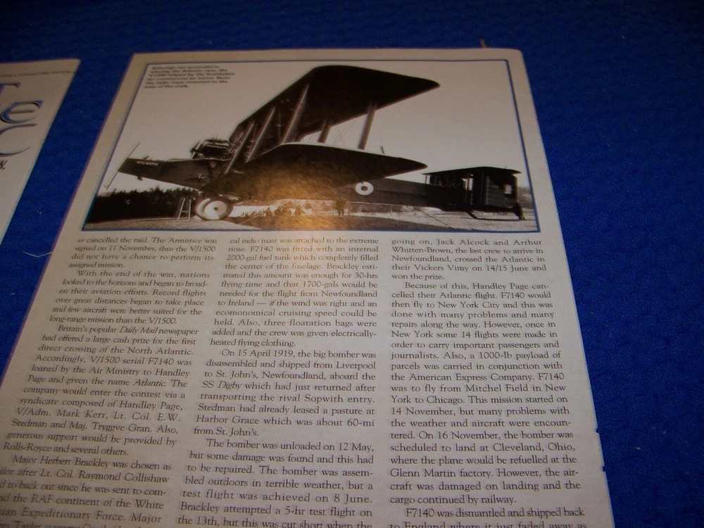 UP FOR SALE IS AN ORIGINAL PRINT 3-PAGE ARTICLE ON......... ....... HANDLEY-PAGE V/1500 "FLIGHT OF THE ATLANTIC" (3-PAGES) Page/s size: APROX: 8" X 11" SUBJECT: ............... HANDLEY-PAGE V/1500 "FLIGHT OF THE ATLANTIC" (3-PAGES) AUTHOR/ARTIST: N/A YEAR: 2001 ORIGINAL PRINT SCALE: N/A ARTICLE FEATURES: -HANDLEY-PAGE V/1500 "FLIGHT OF THE ATLANTIC" (3-PAGES) . ..STORY/HISTORY/DETAILS/2-PAGE HEADER PHOTO PAGES ..A MUST HAVE ON THE HANDLEY-PAGE V/1500 "FLIGHT OF THE ATLANTIC" CONDITION: GREAT........... **SOLD FOR 3-PAGE/S ON SUBJECT LISTED ABOVE AND/OR DRAWINGS/CUTAWAY ONLY... ANY OTHER ARTICLE ON BACK OF DRAWINGS/ARTICLE ARE NOT REPRESENTED IN THIS AUCTION!*** (REMEMEBER THESE ARTICLES ARE EXTREMELY OLD AND RARE...SOME MAY HAVE SOME BORDER DISCOLORATION/SMALL EDGE CHIPS/PAGE DISCOLORATION).....SEE CONDITION AND NOTES LISTED ABOVE AS TO EACH ARTICLE! **THESE ARE AIRCRAFT ARTICLES THAT HAVE BEEN EXTRACTED FROM VINTAGE MAGAZINES/ECT,.. AND ARE INDIVIDUAL PAGES OF EACH SUBJECT AND SOLD AS COMPLETE ARTICLES ON EACH SAID AIRCRAFT AS LISTED ABOVE!...... NOT SOLD AS A COMPLETE MAGAZINE or BOOKLET!!! **all articles are shipped flat on cardboard flat and mail flat in manilla envelope to INSURE condition! ** I DO OFFER COMBINED SHIPPING ON MULTIPLE ITEMS PURCHASED