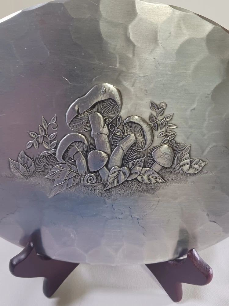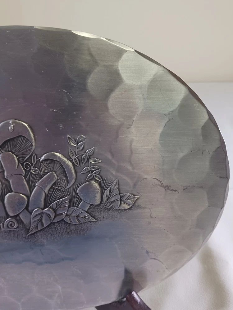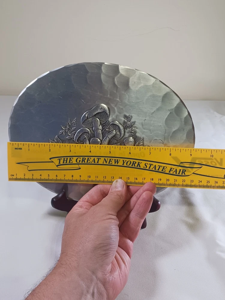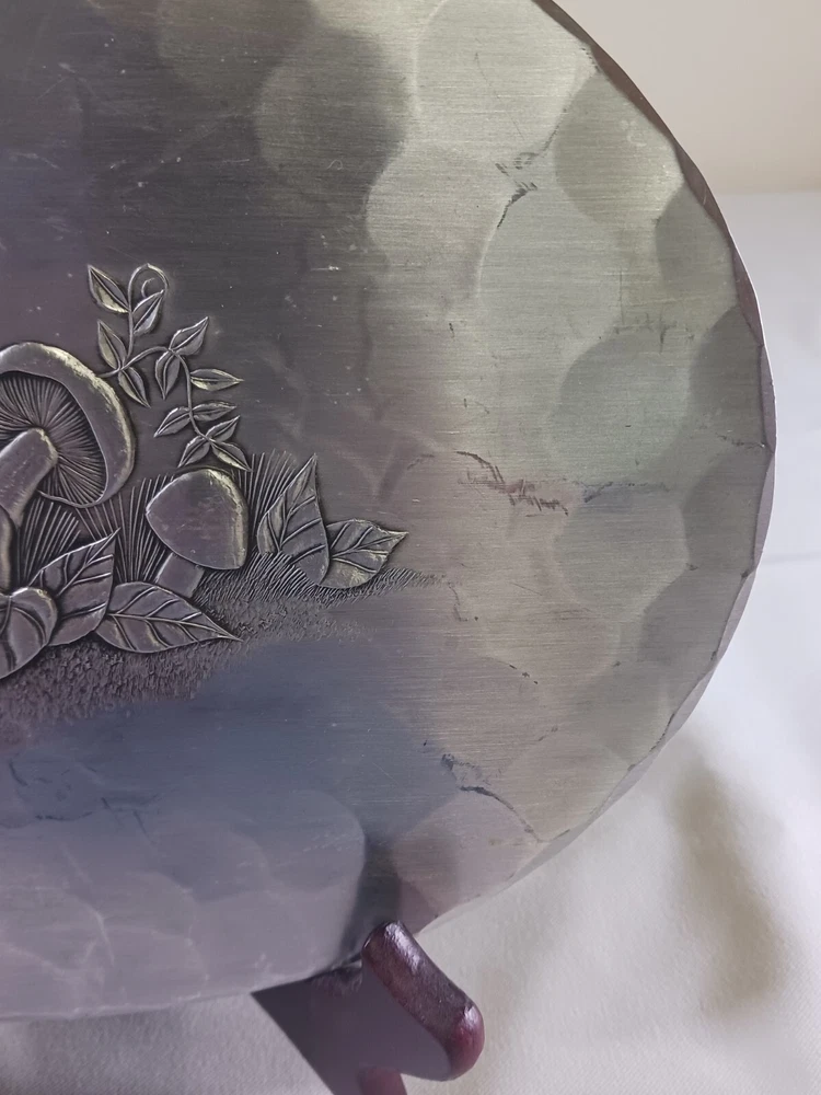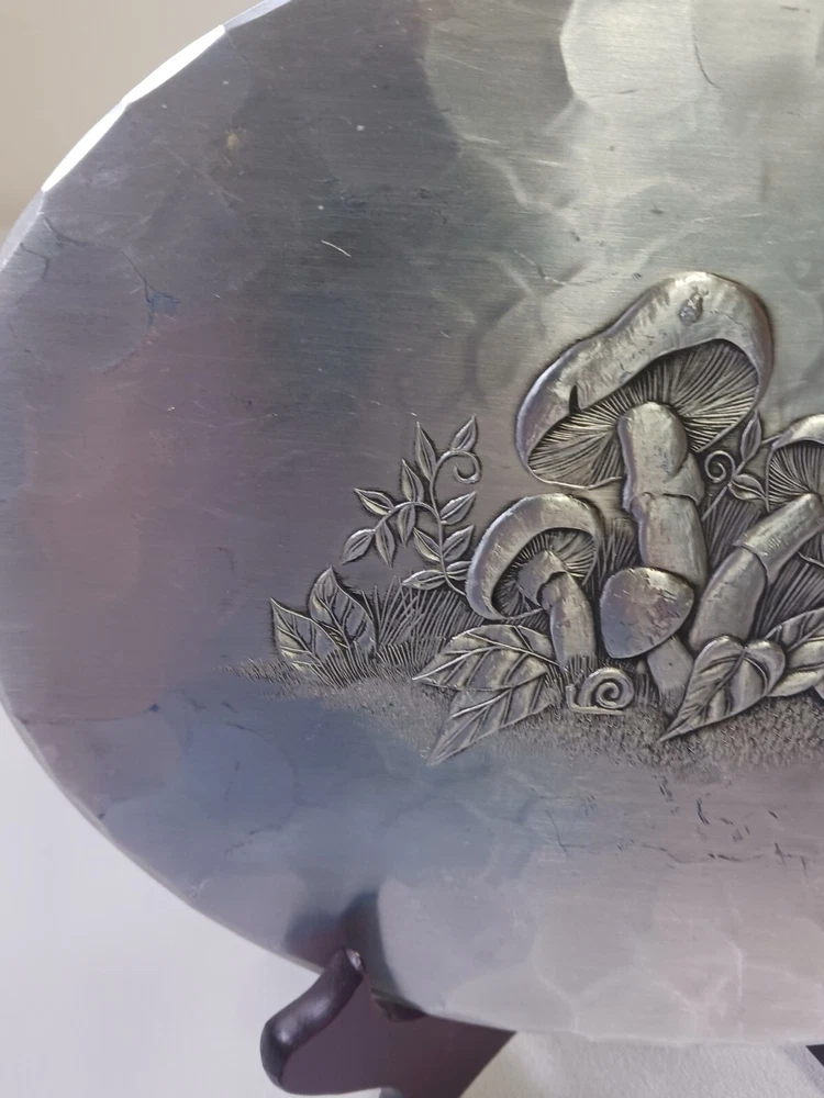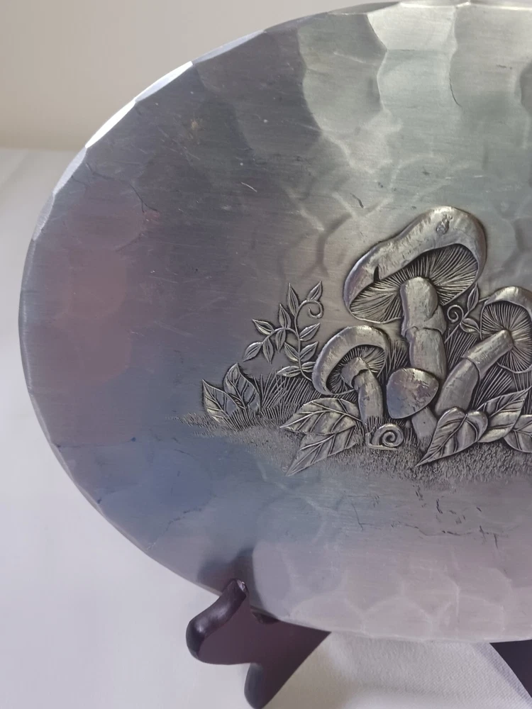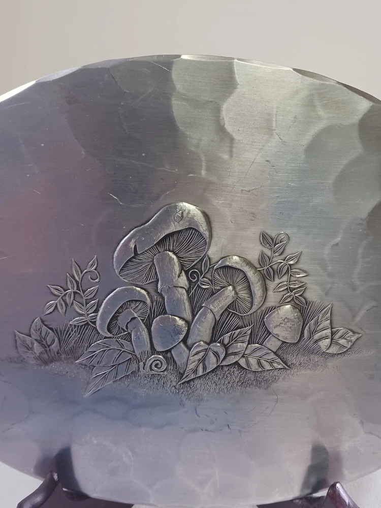 HANDMADE ALUMINUM HOT PLATE, MUSHROOM DESIGN, 9 INCHES, UNMARKED, FELT BOTTOM