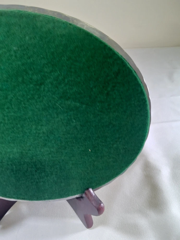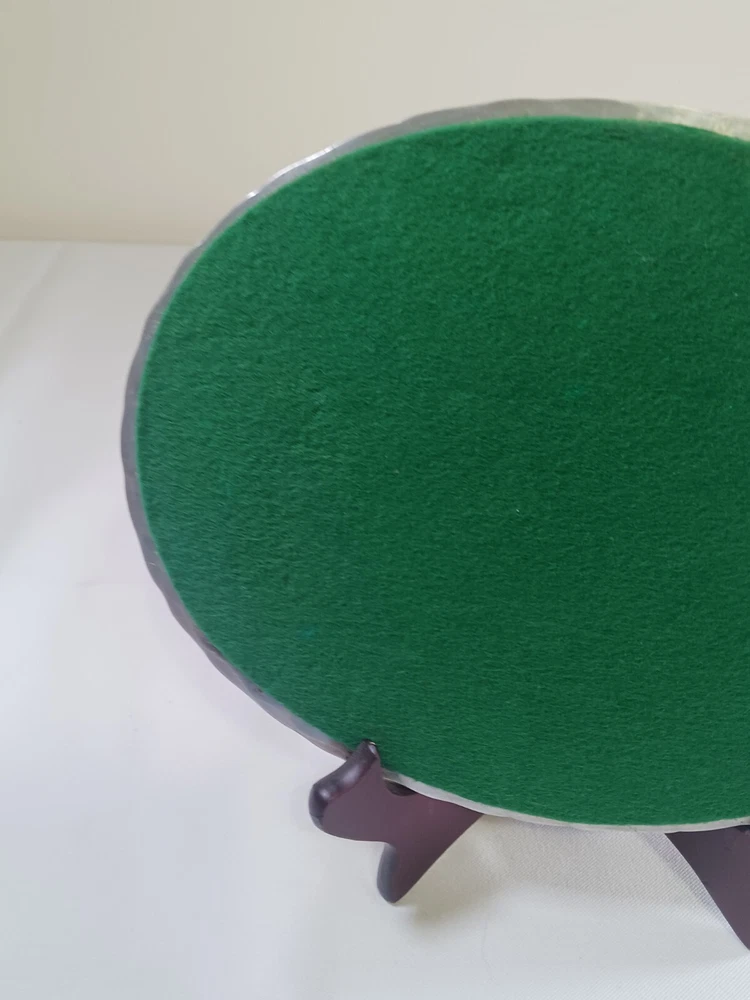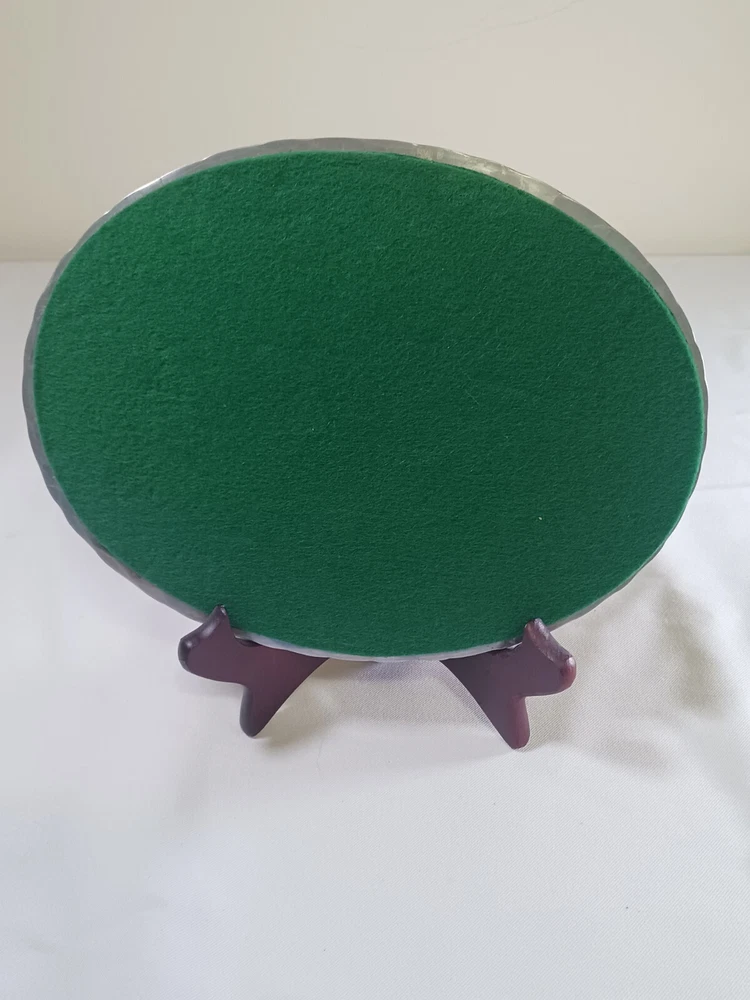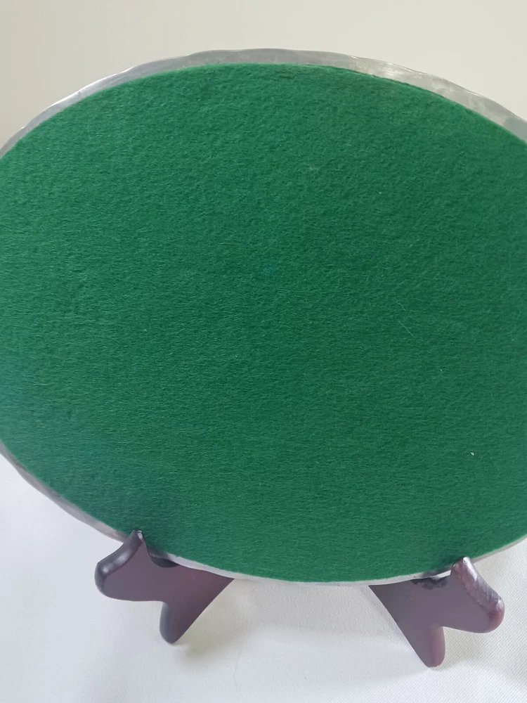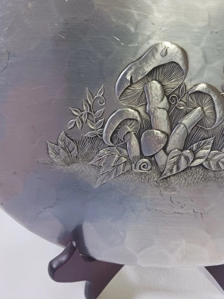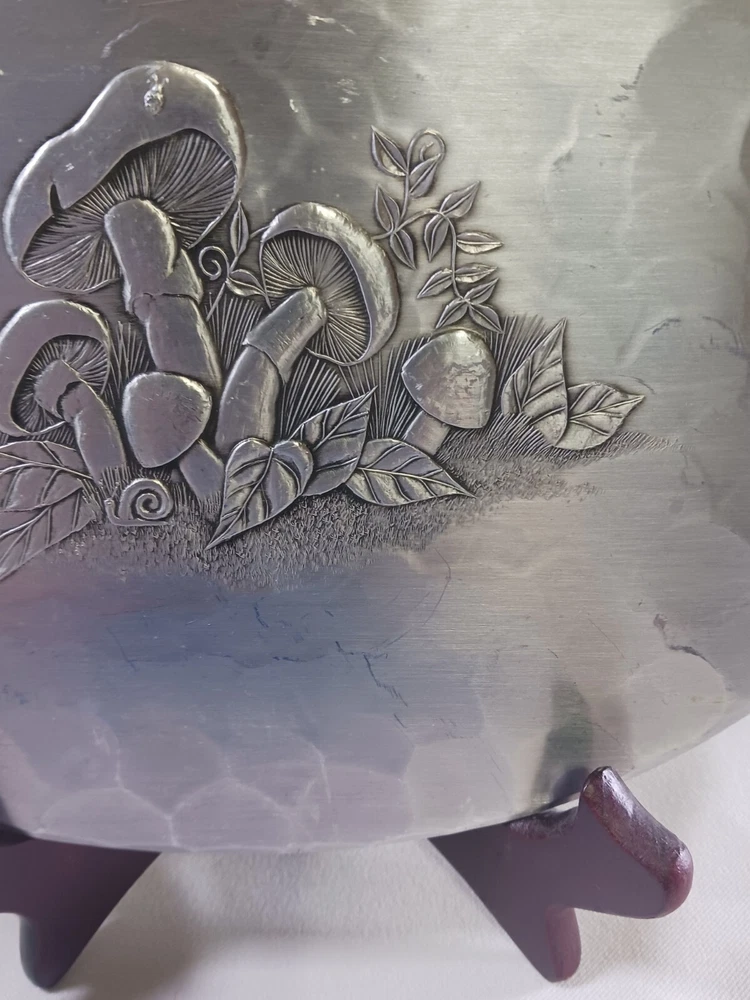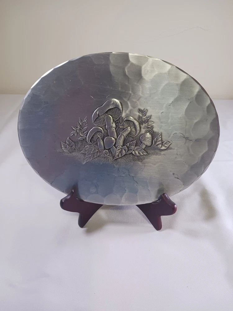 HANDMADE ALUMINUM HOT PLATE, MUSHROOM DESIGN, 9 INCHES, UNMARKED, FELT BOTTOM