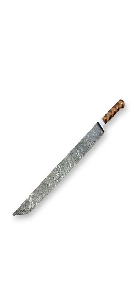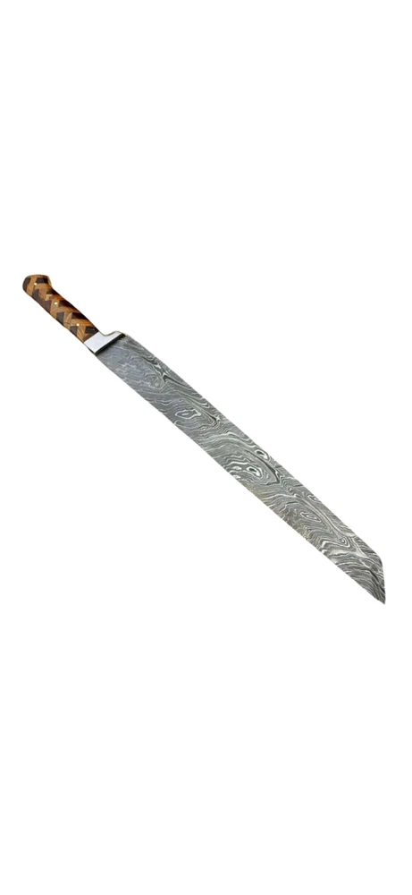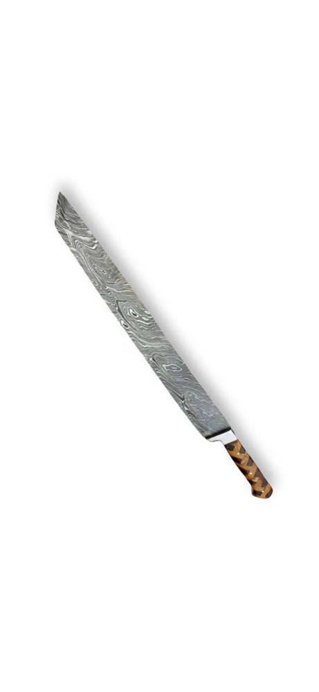 HAND FORGED DAMASCUS STEEL BUTCHER/BRISKE T CHEF KNIFE Blade of this knife has a nice file work and is made of 256 layers of stainless steel and high carbon steel with hardness 56-58 HRC. This process takes approximately 48 hours to complete. Specifications: Handle Material : ROSE AND OLIVE WOOD Lanyard Hole : ------- Blade Material : Damascus steel Overall Length :17.5" inch Handle Length : 5.5" inch Blade Length : 12" inch Layers: 256 Sheath Material: Leather Hardness: 56-58 HRC Package Includes: Knife and Leather Sheath Packing: Our products are packed after oiling and finishing as per tool requirements which are safe and reliable AGE RESTRICTION: WE DON'T SELL KNIVES TO ANY ONE WHO IS UNDER AGE 18. WHEN YOU BUY A KNIFE FROM US YOU ARE CONFIRMING THAT YOUR AGE QUALIFIES FOR THIS PURCHASE AND THIS IS A LEGAL PURCHASE. Warning: Take care when removing product from packaging. Keep fingers clear of blades. Keep away from children. We are not responsible for injuries caused by the use of this item. FEEDBACK POLICY: YOUR FEEDBACK IS VERY IMPORTANT FOR US, IF THEIR IS ANY KIND OF PROBLEM PLEASE GIVE US OPPORTUNITY TO SORT THE ISSUE