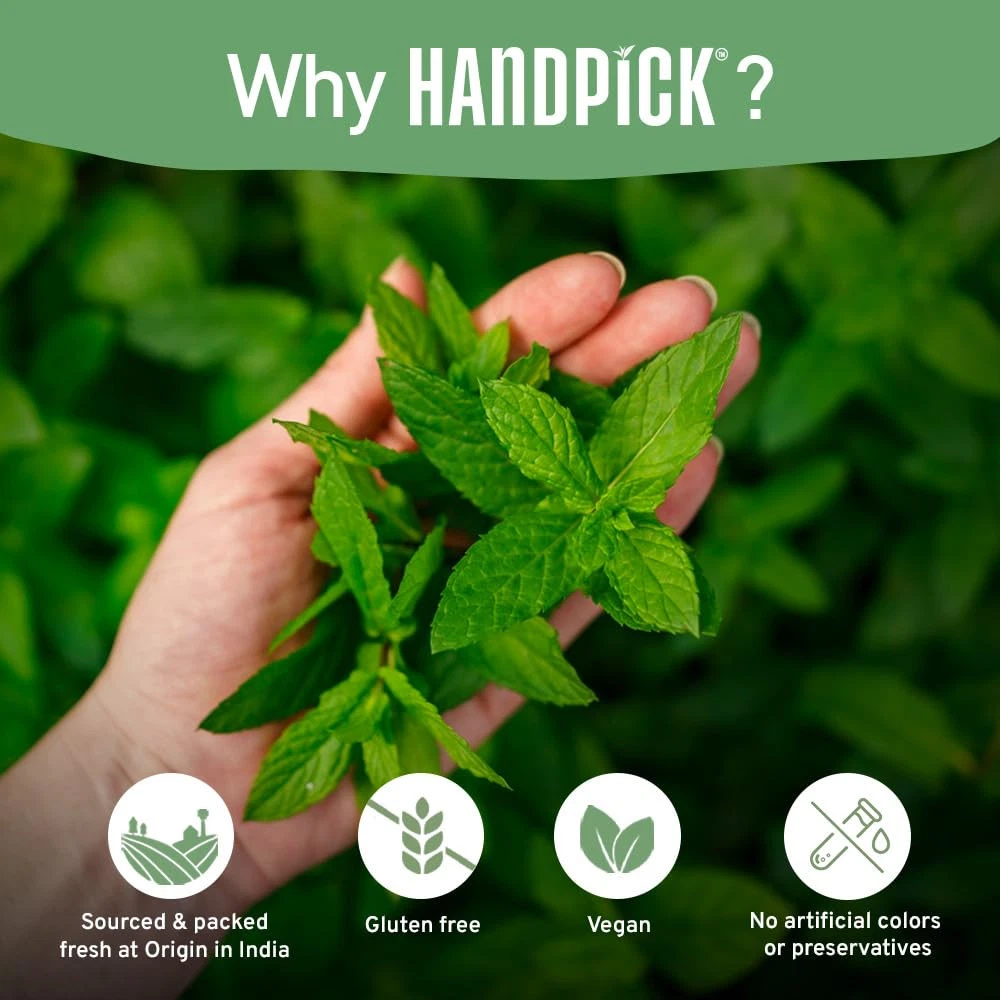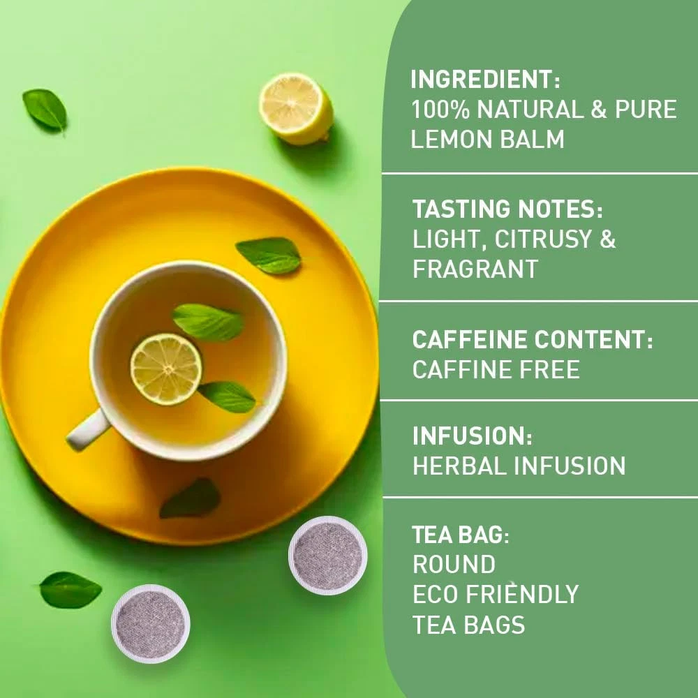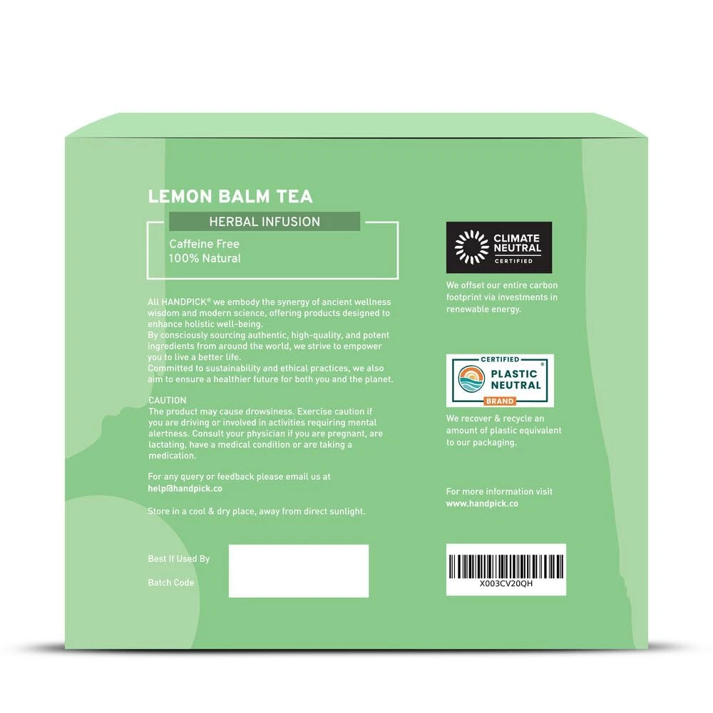 HANDPICK, Lemon Balm Tea Bags (100 Herbal Tea Bags) Melissa Tea - Caffeine-Free, Citrus Flavor & Aroma | Pure Ingredients - Lemon Balm Leaves | Brew Pure Lemon Balm Tea Product Details Package Dimensions : 6.38 x 5.59 x 2.8 inches; 3.53 ounces UPC : 810001618087 Manufacturer : VAHDAM Brand: HANDPICK Item Form: Teabags Flavor: Lemon Tea Variety: Lemon Balm Unit Count: 100.00 Count CITRUSY & DELICIOUS LEMON BALM HERBAL TEA - Indulge in the citrusy and delicious flavors of our Lemon Balm herbal tea, a delightful infusion that will captivate your taste buds. Each sip offers a refreshing and invigorating experience, making it the perfect choice for a beverage as it delights your senses with its vibrant citrus notes and delightful flavors. NON-GMO, GLUTEN FREE & PURE LEMON BALM TEA- HANDPICK brings a unique twist in your daily cup of herbal tea, brewing the flavors and nutrition of Indian spices that is Gluten Free, Caffeine Free and loaded with nutrition of pure ingredients that will instantly become your new favorite. Just a bliss of pure herbal tea loaded with nutrition and taste without any artificial flavor, added preservatives! EMBRACE A BALANCED LIFESTYLE.- Add this tisane that smells good, tastes good, and does good to your daily regime to put a pep in your step whenever you need it with this nutritious tea made of pure ingredients and no added preservatives. WE CARE FOR PEOPLE & PLANET - We are now a proudly Carbon-Neutral & a Plastic-Neutral brand. We measure our overall carbon & plastic footprint & offset it via our investments in environment sustainability initiatives in India.