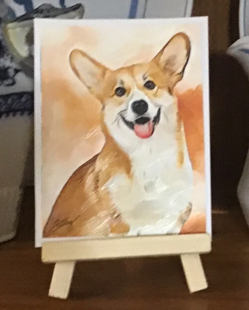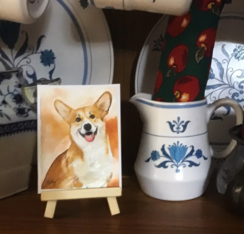 HANDSOME DOG Miniature Painting 2.5”"x3.5” This is a print of the original painting It is signed by the artist and dated on the back. On premium heavy 100# weight card stock Comes with a mini wood easel A good way to collect affordable art!