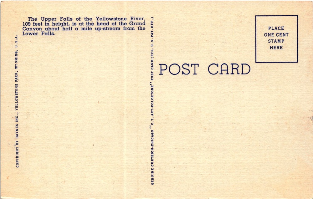 MAKE AN OFFER. THE MORE YOU BUY THE BETTER DEAL I WILL ACCEPT This postcard features an image of the Upper Falls of the Yellowstone River in Yellowstone National Park. The Upper Falls is 109 feet in height and is located at the head of the Grand Canyon of the Yellowstone, about half a mile upstream from the Lower Falls.Yellowstone National Park is located primarily in the U.S.