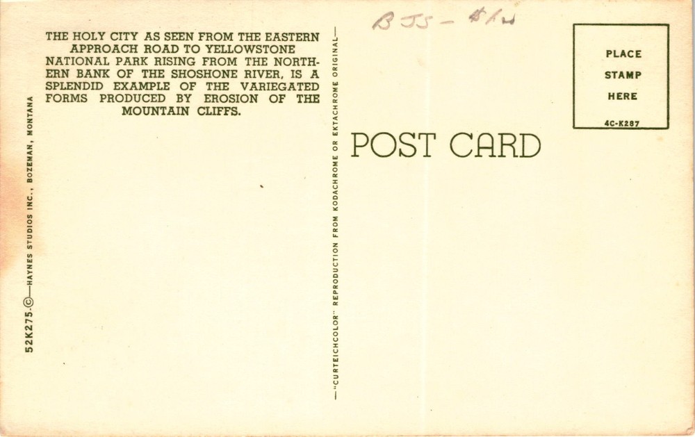 The postcard features a view of The Holy City as seen from the eastern approach road to Yellowstone National Park, rising from the northern bank of the Shoshone River. The image showcases the variegated forms produced by erosion of the mountain cliffs in the area. The postcard was produced by Haynes Studios Inc.