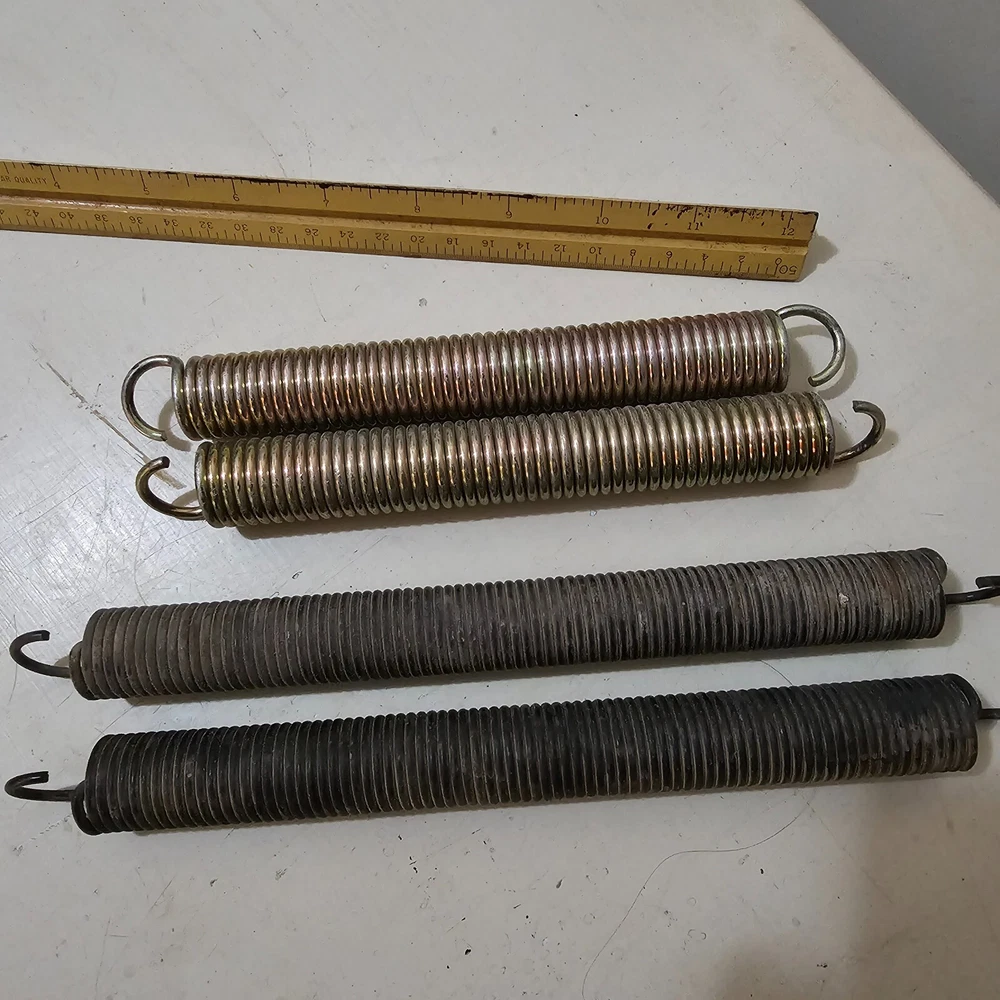 HEAVY DUTY STEEL EXTENSION SPRINGS with HOOKS 8" with 6" pair doors load hinge 4 springs total. Item is used recycled springs. 2 six-inch springs. 2 eight inch springs.