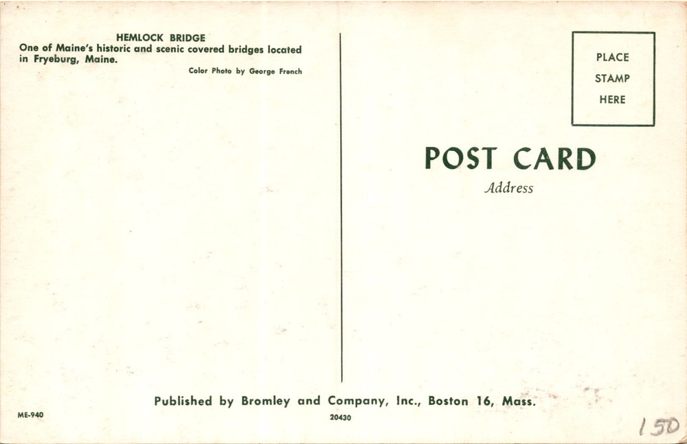 MAKE AN OFFER. THE MORE YOU BUY THE BETTER DEAL I WILL ACCEPT The postcard features a color photo of the Hemlock Bridge, a historic and picturesque covered bridge in Fryeburg, Maine. The bridge is a notable landmark in Maine, known for its scenic beauty and historical significance. The photo was taken by George French and the postcard was published by Bromley and Company, Inc. in Boston.