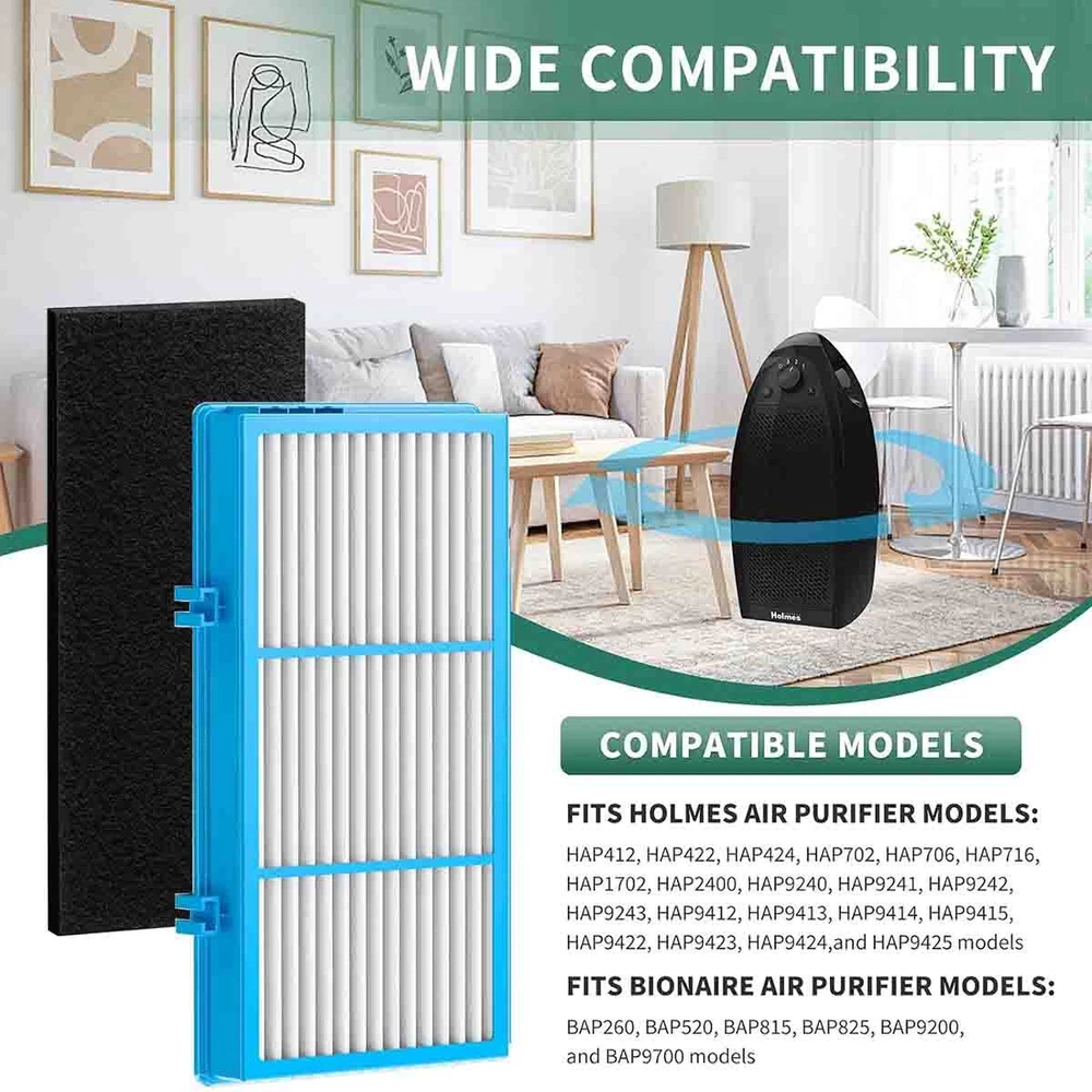 Product features: HEPA-Type filtration effectively removes up to 99% of smoke and pollutants from the airstream; Captures allergens and pollutants as small as 2 microns; Made of Cotton; Powerful carbon air filter replacement is enhanced with baking soda uses charcoal with oxygen to create tiny pores between the carbon atoms to trap odors and pollutants; Helps control odors from pets, bathrooms, garbage, nurseries, and kitchens; For best results change every 8-12 months. Package includes: replacement HEPA filters; replacement carbon booster sheets. Fits Holmes air purifiers models: HAP412, HAP422, HAP424, HAP702, HAP706, HAP716, HAP1702, HAP2400, HAP9240, HAP9241, HAP9242, HAP9243, HAP9412, HAP9413, HAP9414, HAP9415, HAP9422 HAP9423, HAP9424, HAP9425 Also fits Bionaire model air purifier: BAP260, BAP520, BAP815, BAP825, BAP9200, BAP9700. Disclaimer: Not an OEM product. This is not a Holmes original product. This is a generic replacement part compatible with Holmes. Any use of the Holmes brand name, model or part designation for this product is made solely for purposes of demonstrating compatibility. On Feb 13, 2025 at 05:15:56 PST, seller added the following information: