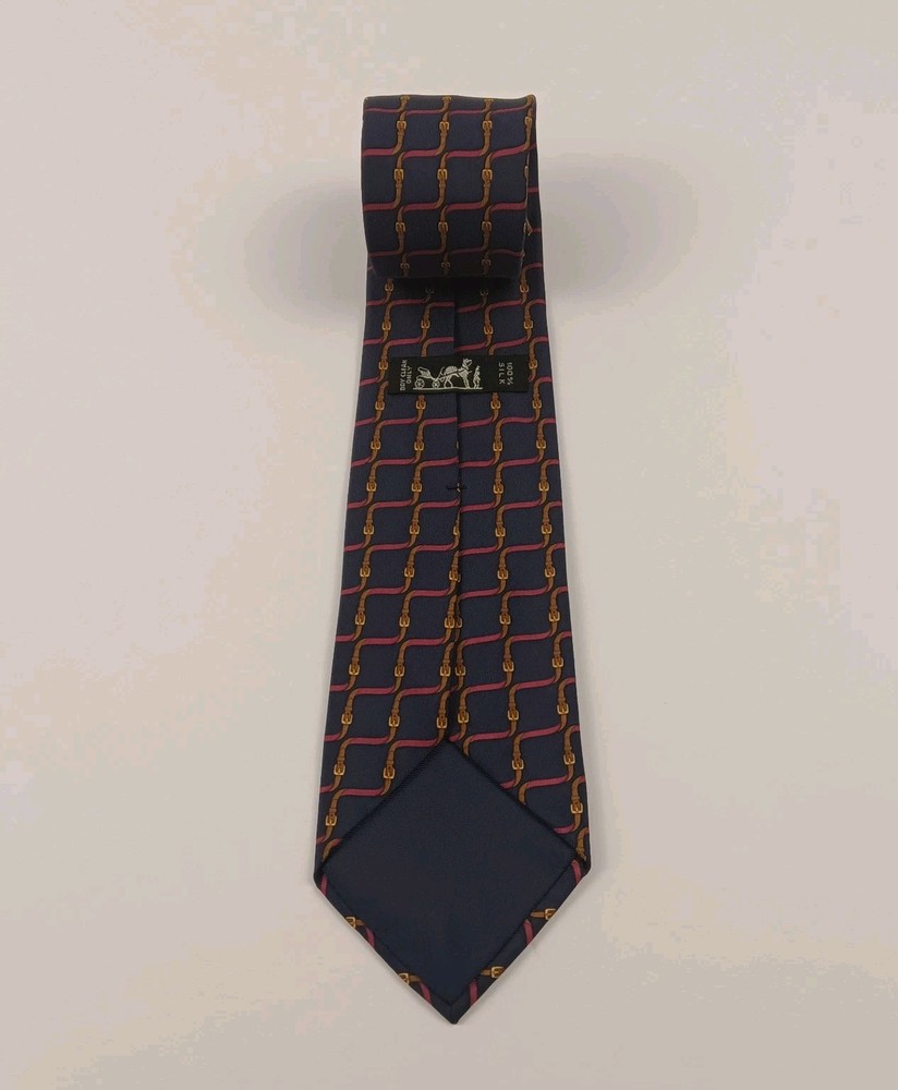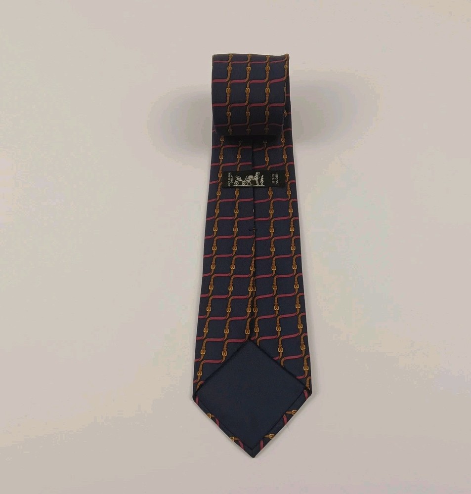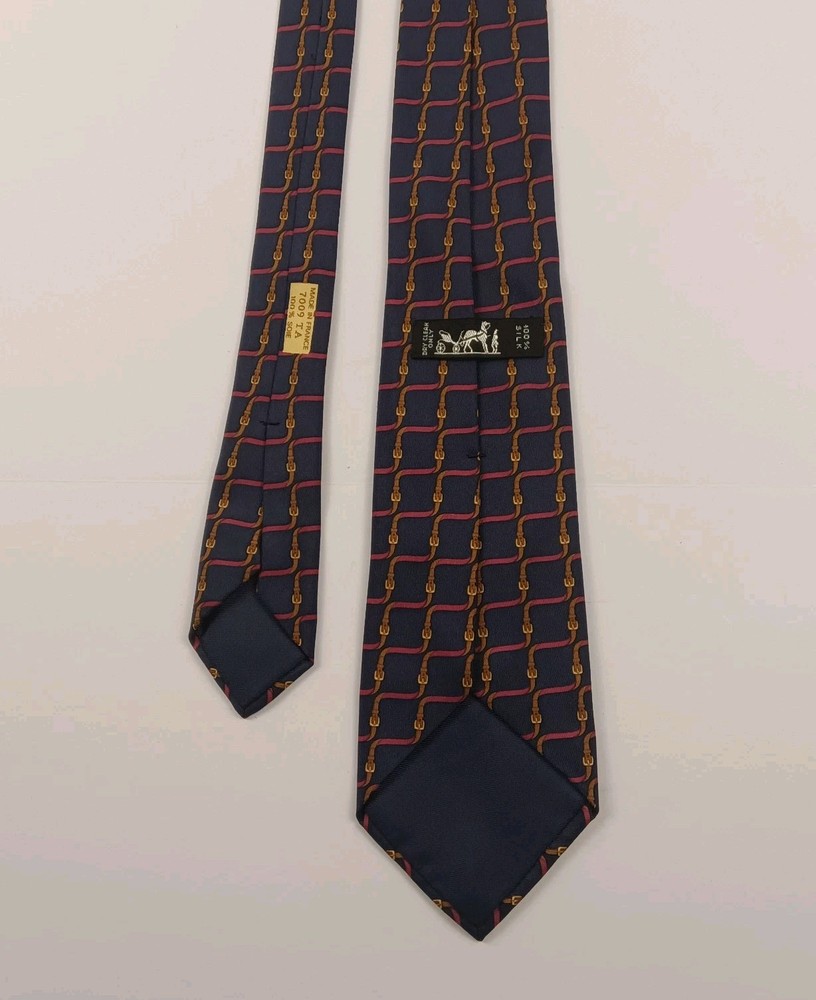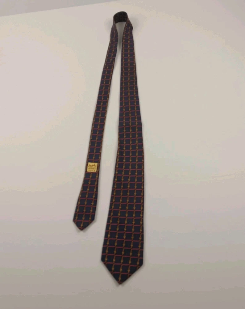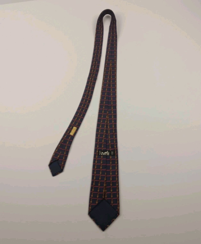 This is a luxurious HERMÈS silk tie from France. It features an interlocking belts print in blue and burgundy colors, with a tricolored design. The tie is in a classic length and width, with a pointed style and adjustable features. The fabric is satin, perfect for adding a sophisticated touch to any outfit.