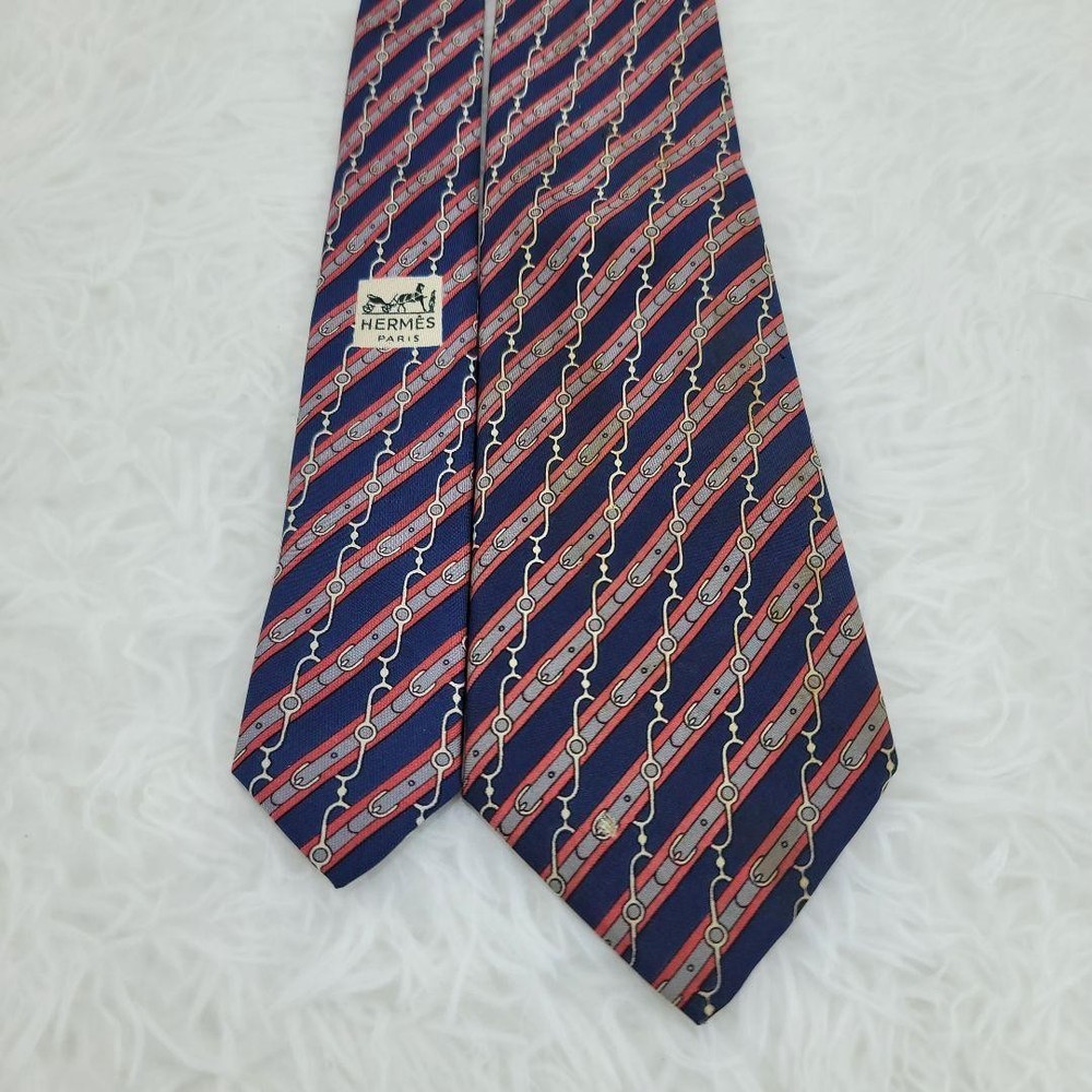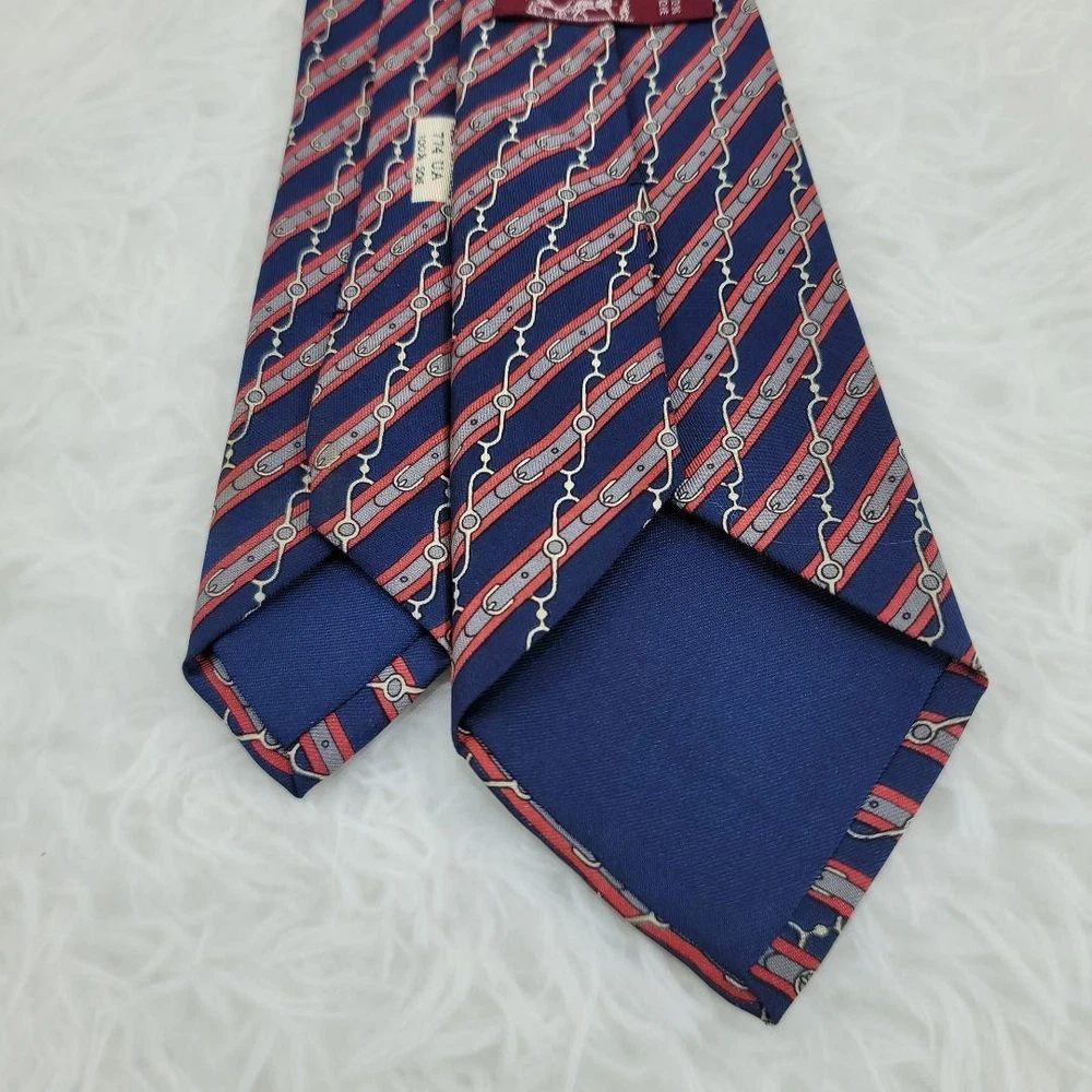 This Hermes tie is absolutely stunning! The navy with red and silver belt pattern looks so elegant. It arrived in great used condition as described and fits perfectly. Such an amazing find for the price!