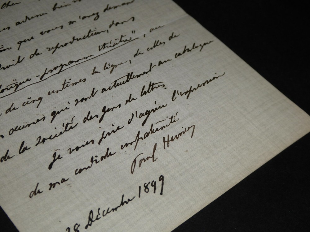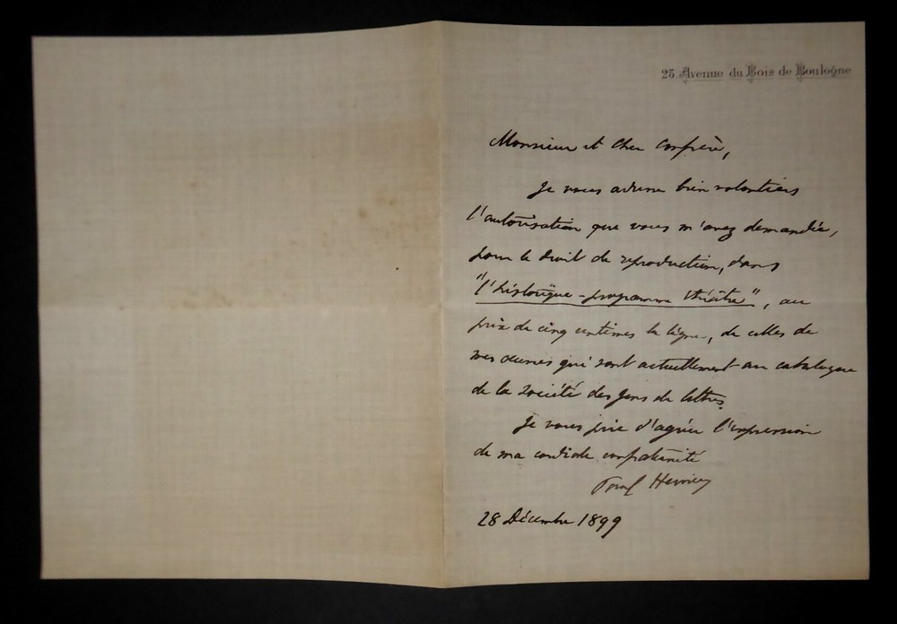 Paul HERVIEU. Lettre autographe signée et datée du 28 décembre 1899. Lettre d'une page adressée à un ami et confrère dans laquelle il donne son autorisation pour la reproduction d'une oeuvre dans L'Historique Programme Théâtre au prix de cinq centimes la ligne. Il ne donne l'autorisation que pour ses œuvres présentent dans le catalogue de la Société des Gens de Lettres. Dimensions : 11.5 x 15 cm . 1 page. Etat : Bon état de conservation. Paul Hervieu, né le 2 septembre 1857 à Neuilly-sur-Seine et mort le 25 octobre 1915 en son domicile dans le 16ᵉ arrondissement de Paris, est un romancier et auteur dramatique français. Wikipédia Envoi soigné dans un emballage rigide et étanche. Satisfait ou remboursé. Si vous n'êtes pas entièrement satisfait, je reprends la marchandise avec retour à ma charge pour l'Europe et à la charge de l'acheteur pour le reste du monde. N’hésitez pas à visiter ma boutique et affiner vos recherches en fonction des catégories qui vous intéressent. Ma boutique L'Art Délivré. Lettres autographes, vieux papiers, livres anciens, photographies, gravures, timbres… Nous expertisons et/ou rachetons dans toute la France vos lettres, collections de lettres et livres anciens. Merci de votre visite. Jérôme KAYSER. Lettre d'une page adressée à un ami et confrère dans laquelle il donne son autorisation pour la reproduction d'une oeuvre dans L'Historique Programme Théâtre au prix de cinq centimes la ligne. Il ne donne l'autorisation que pour ses œuvres présentent dans le catalogue de la Société des Gens de Lettres. Paul Hervieu, né le 2 septembre 1857 à Neuilly-sur-Seine et mort le 25 octobre 1915 en son domicile dans le 16ᵉ arrondissement de Paris, est un romancier et auteur dramatique français. Wikipédia Satisfait ou remboursé. Si vous n'êtes pas entièrement satisfait, je reprends la marchandise avec retour à ma charge pour l'Europe et à la charge de l'acheteur pour le reste du monde. N’hésitez pas à visiter ma boutique et affiner vos recherches en fonction des catégories qui vous intéressent. Ma bo