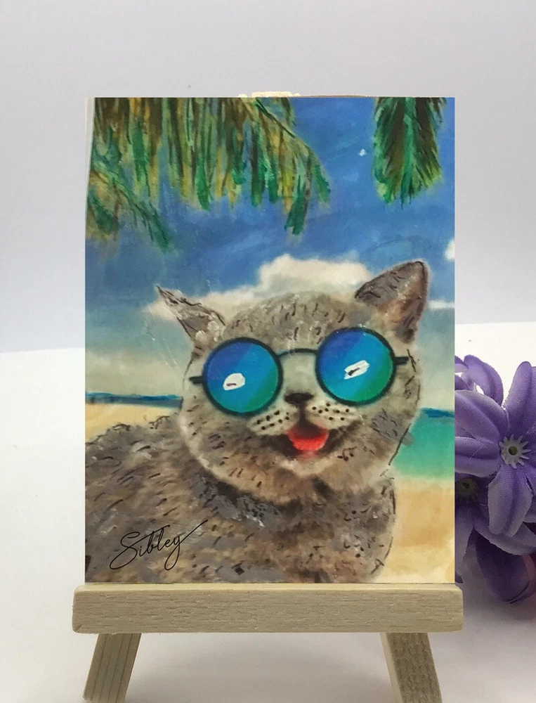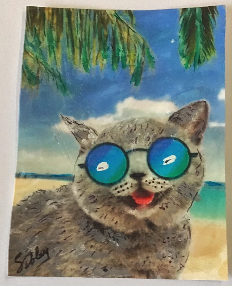 HIP CAT Miniature Painting 2.5”"x3.5” This is a print of the original painting It is signed by the artist and dated on the back. On premium heavy 100# weight card stock Comes with a mini wood easel A good way to collect affordable art!