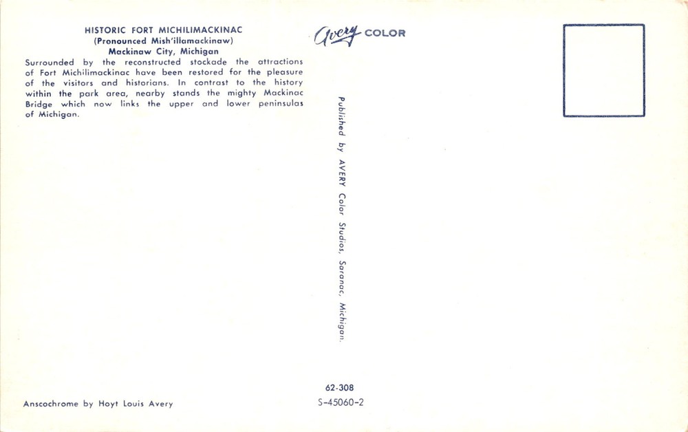 MAKE AN OFFER. THE MORE YOU BUY THE BETTER DEAL I WILL ACCEPT The postcard features a historic site, Fort Michilimackinac, located in Mackinaw City, Michigan. The fort is surrounded by a reconstructed stockade and has attractions that have been restored for visitors and historians. Nearby, the postcard mentions the impressive Mackinac Bridge, which connects the upper and lower peninsulas of Michigan.