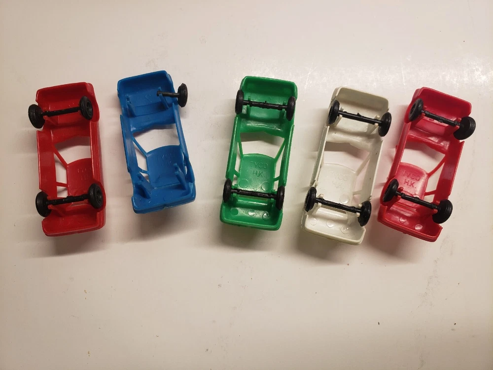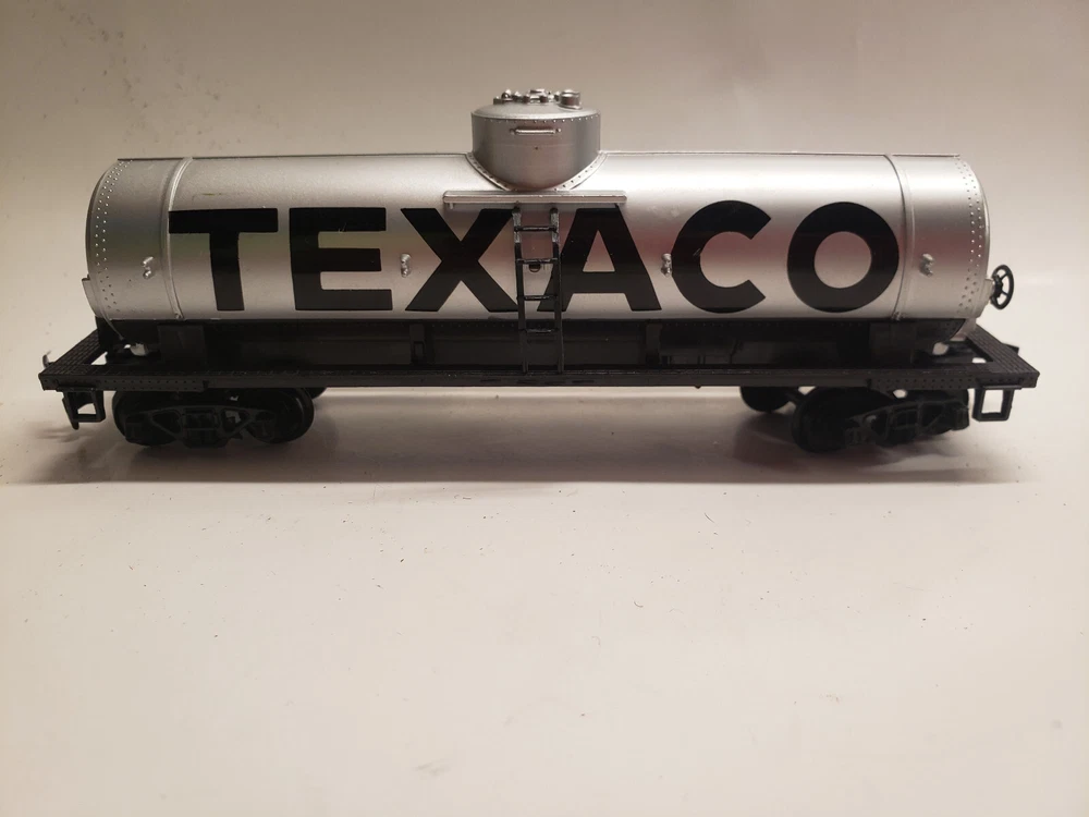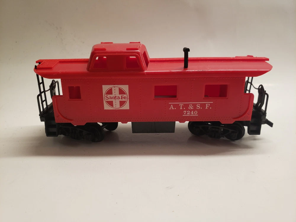 Comes with everything in the photos. The Railroad station and accessories, 4 train cars (Texaco, Cabose, Car Hauler, Log Hauler) The instructions, stickers, misc. pieces, and 5 automobiles ( some have missing wheels.) There is some wear on all the pieces.