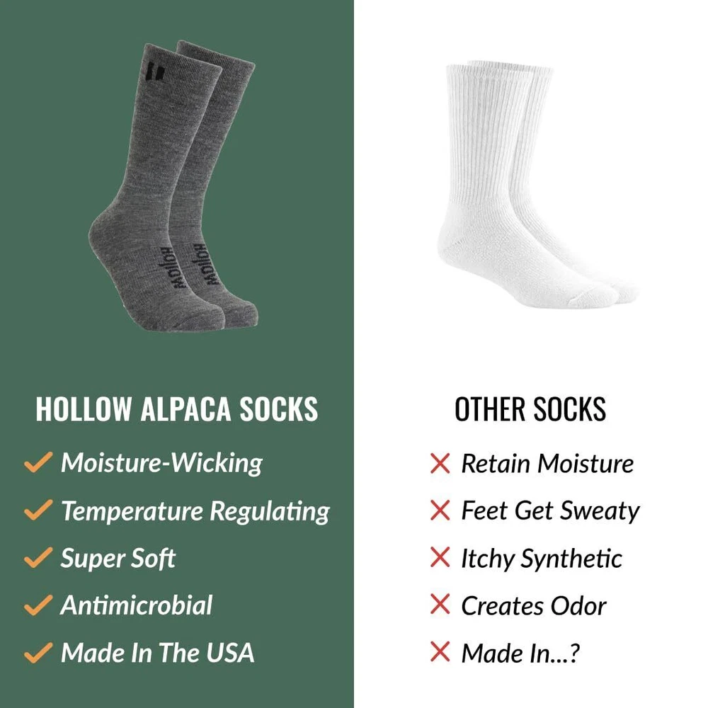 eBay HOLLOW Alpaca Crew Socks for Men and Women, Moisture Wicking Alpaca Socks for Hiking, Running, Outdoors, Any Season Crew Sock, Temperature Regulating, Light Compression, Medium, Grey Description and features SIZE 8-10 CREW SOCKS: Our crew performance alpaca socks are perfect for year round comfort with light compression, a classic crew style sock elevated. Made with 47% Premium Peruvian Baby Alpaca Fiber, 47% Nylon and 6% Spandex. Available in grey and black and a variety of sizes for men and women. FOR EVERY ACTIVITY: Softer and stronger than most other materials typically found in socks, alpaca fiber continues to prove it can withstand a wide range of activities and adventures. Whether you’re looking for hiking socks, hunting socks, running socks, thermal socks, warm socks, winter socks, ski socks, or just a pair of cozy socks for work or relaxing - the benefits of Hollow alpaca socks will keep your feet comfortable. LIGHTWEIGHT & BREATHABLE: Compared to traditional merino wool socks, alpaca fibers have better insulation properties at a lighter weight. The hollow fibers help regulate any temperature, keeping feet warmer or cooler for much longer periods of time. Alpaca fiber is a unique material that can wick moisture, to help keep feet dry and endure long wear. HYPOALLERGENIC & ITCH FREE: Because alpaca fiber is lanolin-free, our alpaca socks for men and women are hypoallergenic and itch-free. The structure of alpaca fibers is not only soft, it also helps provide a cushion against callus buildups, that may help with blisters and foot health. MADE IN THE USA: Our baby alpaca socks are soft, comfortable, and crafted for easy cleaning. Simply wash in cool water and hang to dry. Designed in Wisconsin by outdoor enthusiasts, and made in North Carolina Return Policy ⦿ All our products come with a 30-Day Return Policy. If you would like to return your item and you are within 30 days of the purchase, and it is still in its original condition, you can return the item by contacting us through eBay messaging. ⦿ If you are not 100% satisfied, please let us know the Detailed Problem,We will give you a 100% satisfactory solution ⦿ If you received an incorrect, damaged, defective, or item not as described, contact us for a partial/full refund or replacement on our cost. ⦿ Free Shipping and Free Return 30-Days Money Back Guarantee. ☎ For all returned products, buyers MUST contact us for the returning address. Shipping ⦿ We do not ship to a different address. we will ship to the address you provide on the ebay only. Please check your address before purchase. ⦿ It should take 2-4 business days for the product to reach your destination. ⦿ If the product doesn't reach your destination within the time limit, please give it an additional 1-2 business days in case of postal delays and/or possible technical issues. ⦿ We use a selection of shipping services such as UPS, FedEx, USPS etc. ⦿ We ship only to the 48 contiguous states of America. We do not ship to Hawaii, Alaska, US Protectorates, APO/FPO addresses. Local pickups are not offered. ☎ If it takes any longer than that, please do not hesitate to contact us to resolve the issues. Contact us ☎ Please contact us via eBay message. And your message will be replied within 1 business days. For any queries, please feel free to contact us, we will get back to you as quickly as possible. Customer 100% satisfaction is our first priority and goal. We are always working hard for maintain high standards of excellence and resolve your problem in best way. So your POSITIVE FEEDBACK is very important. If you have any problem of the item, please feel free to let us know before leaving your feedback. We will try our best to solve your problem. About us We are here to give you quality products, competitive pricing and amazing service in order to make sure you get the best deal online, Thank you for your business and the opportunity to serve you.