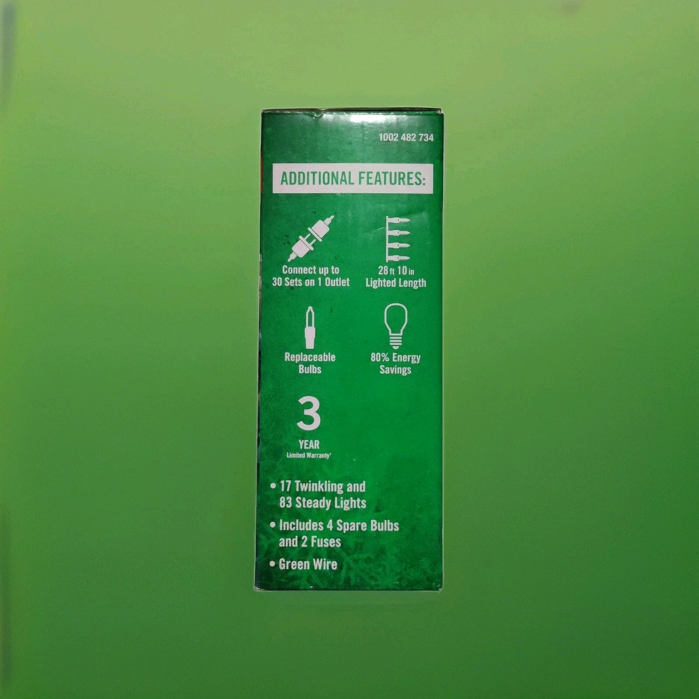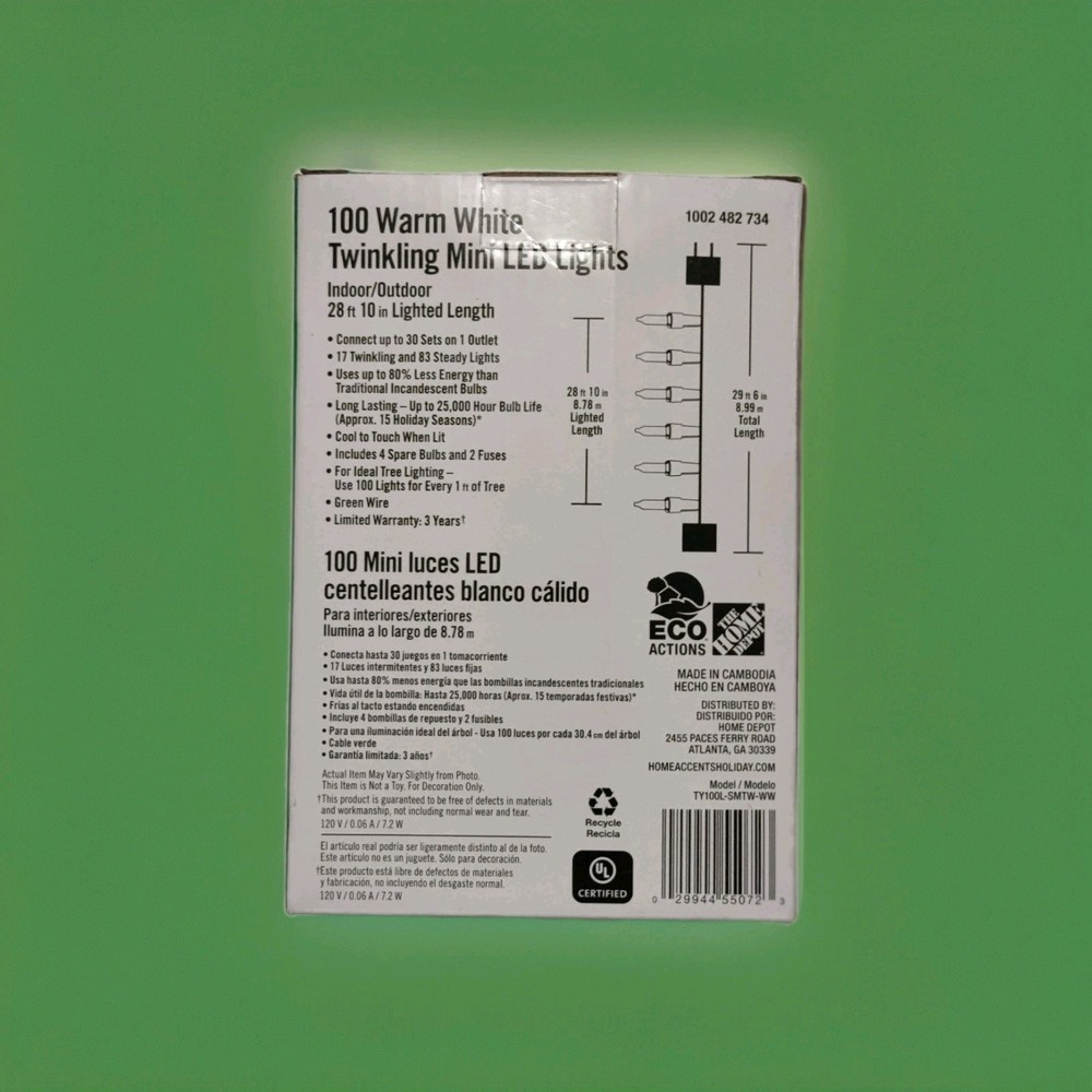 The HOME ACCENTS HOLIDAY 1002 482 734 100CT WARM WHITE MINI LED TWINKLING 28' string lights are perfect for adding a festive touch to your holiday decor. With 100 warm white mini LED lights featuring a twinkling design, these traditional style string lights are safe for both indoor and outdoor use. Easy to set up with a plug control style, these lights offer a warm white color temperature and are designed with a crystal pattern. The electric-powered lights are made of plastic and have a green cord, making them a versatile and charming addition to your holiday celebrations.