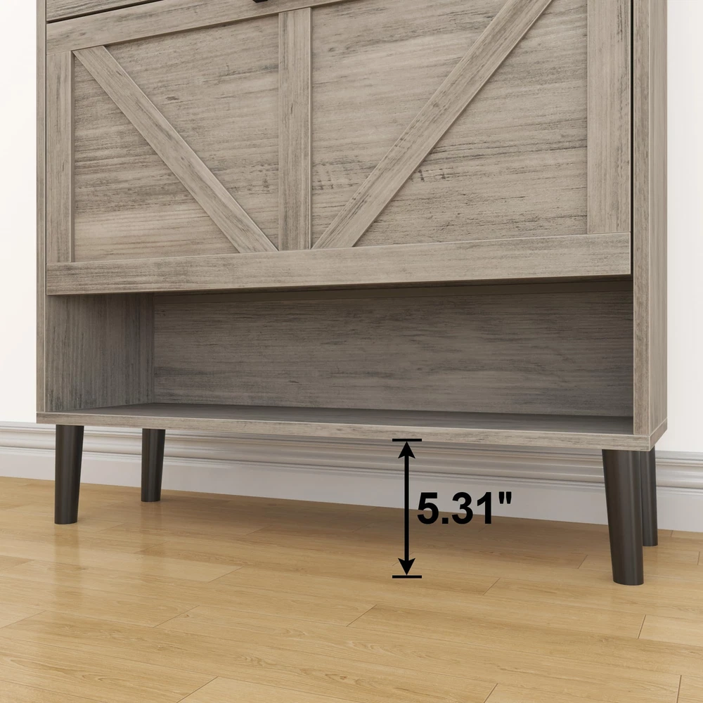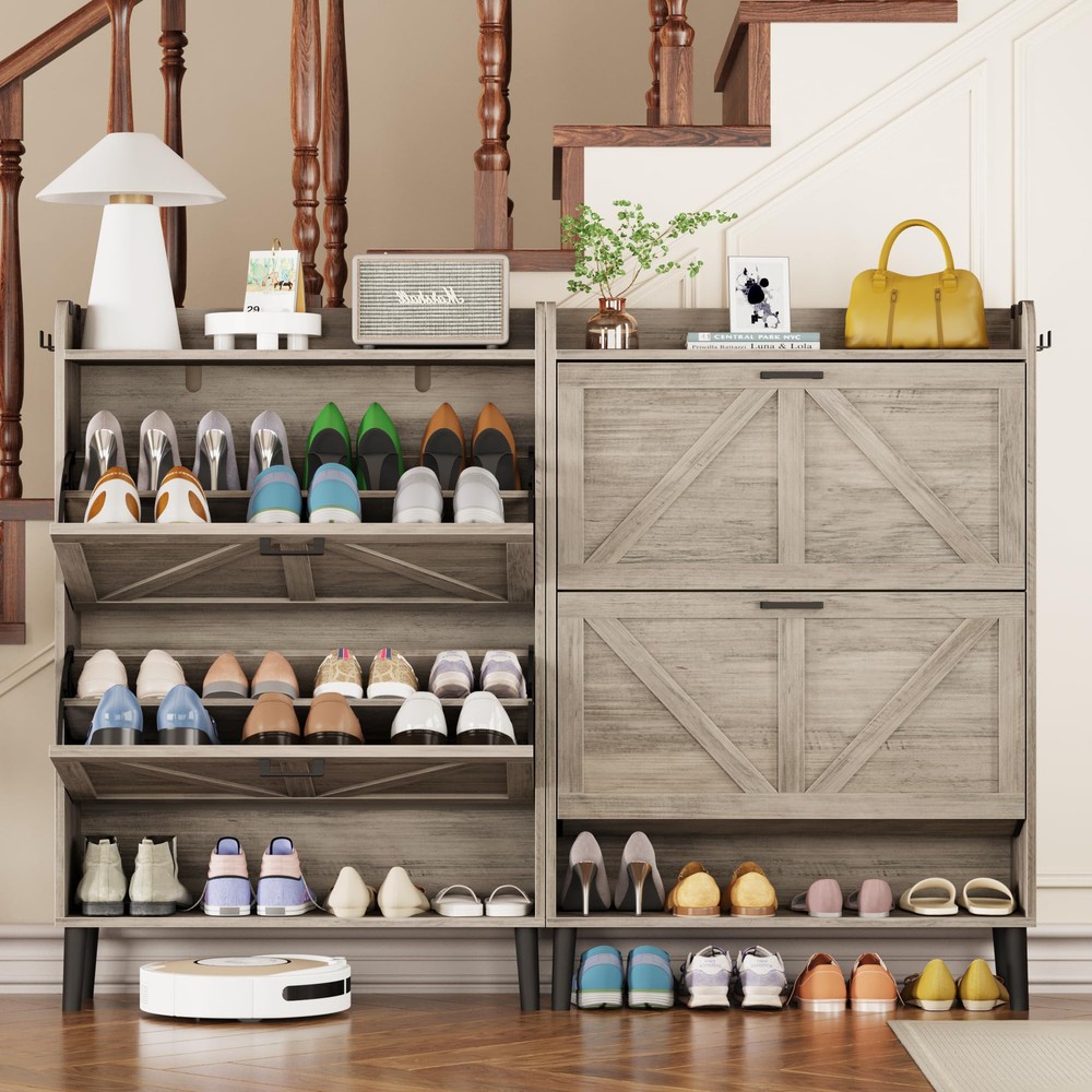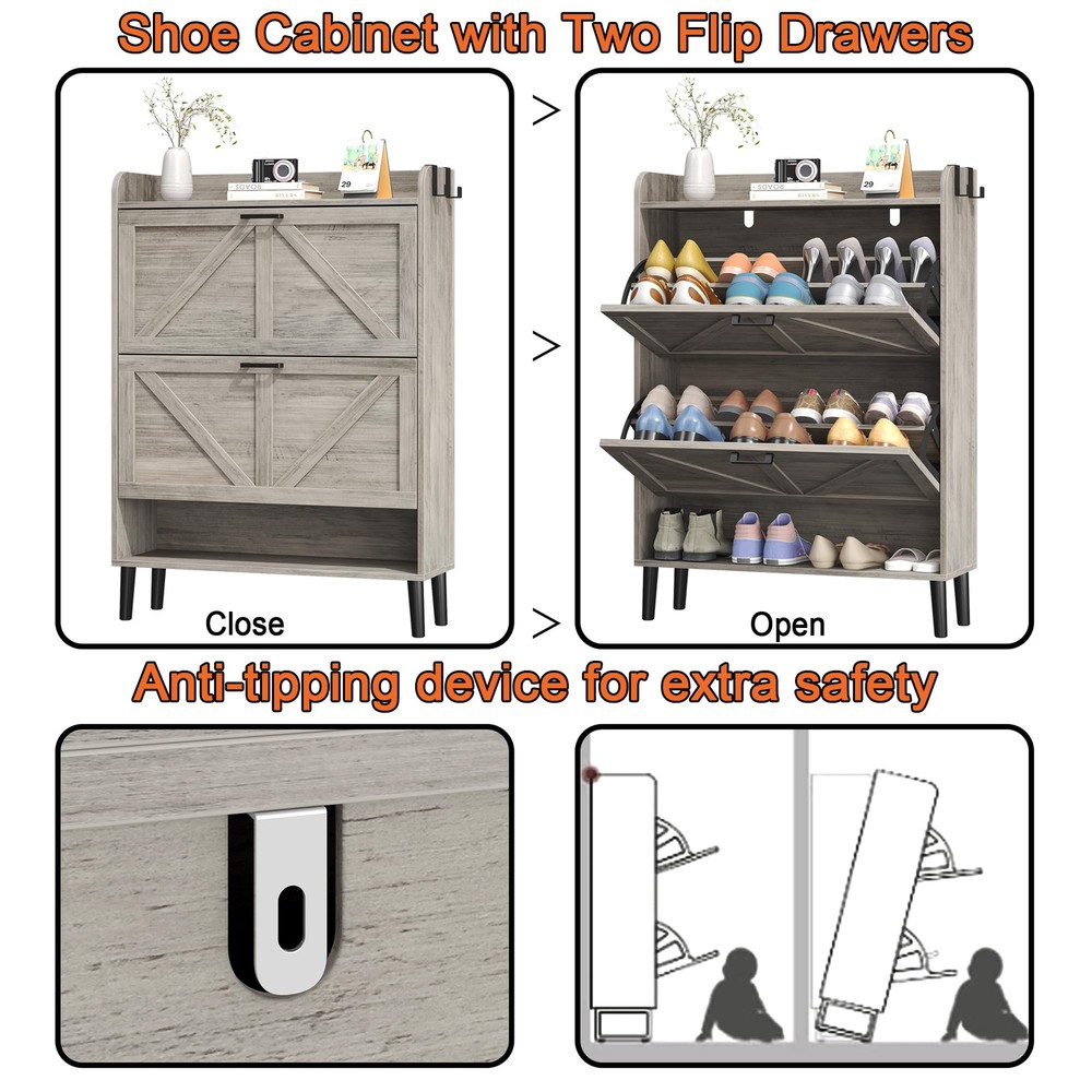 Hidden Shoe Cabinet for Entryway: This cabinet-style shoe storage helps keep the entrance free from clutter. With two flip doors and two open storage shelves, this modern shoe cabinet provides ample space for shoes to eliminate the chaos around your home. It can accommodate most types of shoes, including boots, high heels, and sneakers. It is ideal for placing in the front door entrance, foyer, hallway, or living room. The racks can be closed to keep the shoe mess under control. Space-Saving and Freestanding Shoe Cabinet Storage: Due to its slim design, this shoe dresser takes up minimal space and can fit against a small wall in the corner of your room. The narrow dimension of 30" Wx9.45"Dx43.3" H allows shoes to be stored inconspicuously without protruding into the walkway. Item weight:17.80kg/39.16 lbs. Flip Drawer Shoe Cabinet Organizer with Large Capacity: This shoe dresser is made of 15mm thick particleboard and comes with solid wood legs, ensuring a stable structure that can withstand daily use for years to come. The flip drawer contains two layers of storage racks, and each layer can fit about 4-5 pairs of shoes. The inside panel is removable and can be adjusted to two positions to accommodate various types of footwear, including high heels and boots. Farmhouse-style and Spacious Countertop Shelf: The clean lines and sleek profile give it a retro and stylish appearance and instantly enhance the visual appeal of the hallway or front door. It is an attractive shoe armoire and goes well with a farmhouse-themed home. The cabinet comes with an anti-tipping device for wall mounting to ensure safety. The spacious countertop shelf provides ample space for storing books, keys, photo albums, and other decorative items. Easy and Quick to Assemble: With clearly labeled assembly parts and well-illustrated instructions, this Farmhouse Shoe Rack Cabinet is easy and quick to assemble.