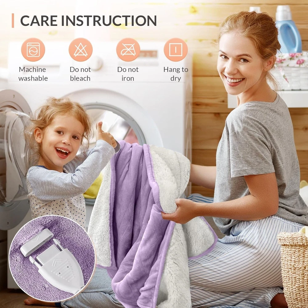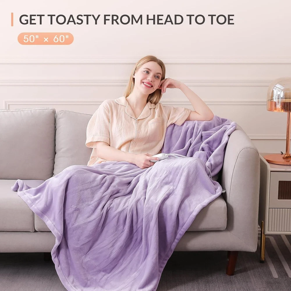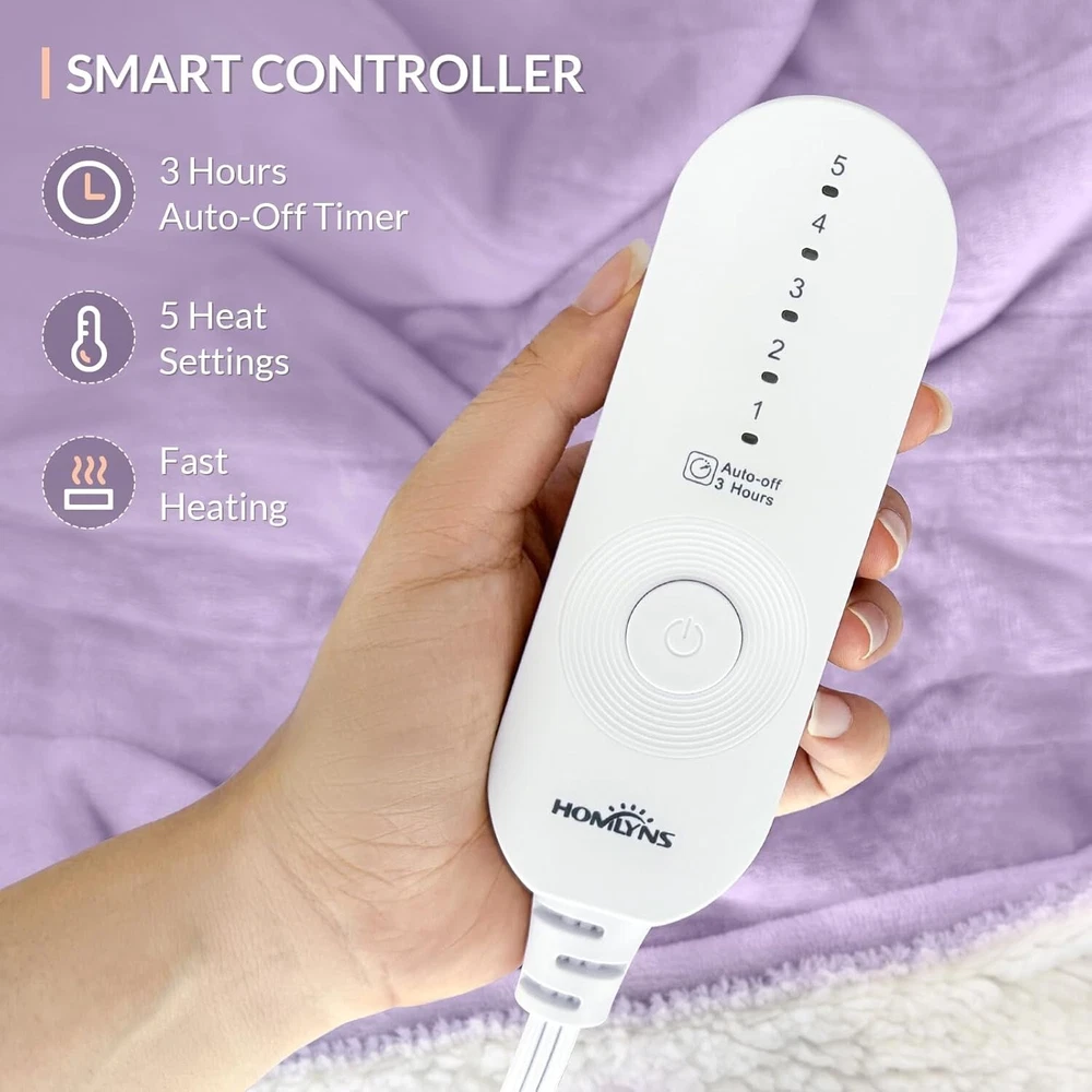 About this item Flannel and Sherpa Easy to Control : Customize your warmth with 5 heat settings from 86℉ to 115℉ for a peaceful night's sleep. Safe : Equipped with Japanese-imported heating wires and ETL certification, it features a 3-hour auto shut-off function to prevent overheating. Therapeutic Heat Relief : Crafted from premium flannel and Sherpa, it offers softness and warmth, enhancing circulation and soothing muscles. Versatile : With an 8.5ft cord, enjoy flexibility on the couch, in bed, or at the office. Energy Efficient : This eco-friendly blanket provides warmth comparable to space heaters with minimal energy use, making it cost-effective and cozy.