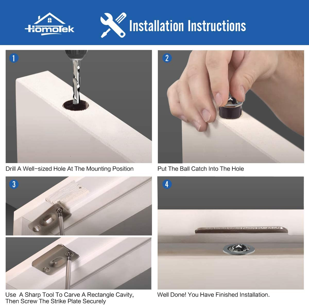 Store New Arrivals Add to Favorite View Feedback Contact HOMOTEK 4 Pack Drive in Ball Catch with Strike Plate for Closet Doors, Satin Nickel, 13/16 Inch X 1-1/8 Inchs,Die-Cast, Adjustable Tension Ball Description Item model number DBC-001-SN-4PK Part Number DBC-001-SN-4PK Style Modern Finish satin Number of Pieces 4 Mounting Type Door Mount Size Name 4 Pack Color Satin Nickle Product Dimensions 1.13"L x 1.13"W x 1.13"Th Material Alloy Steel, Zinc Batteries Required? No Item Weight 10.4 ounces Shape Round Color Name Satin Nickle Manufacturer HOMOTEK Finish Type satin Brand HOMOTEK Size 4 Pack Secure Swinging Doors: Concealed ball-catch system ensures doors stay closed firmly; adjustable steel ball roller provides reliable tension; ideal for maintaining privacy and security in any room Versatile Finishes: Available in black, satin nickel, oil rubbed bronze, and gold; seamlessly integrates with various decor styles; choose the finish that best complements your interior Easy Installation: Includes a steel strike plate and two screws for straightforward setup; designed for quick and hassle-free installation on most closet doors; fits round corner full lip strike plate Robust Construction: Made from durable zinc with a 13/16” diameter bullet body; features a 1” face with lip and 1-1/8” body length; crafted for long-term use and reliable performance Adjustable Functionality: Features an adjustable ball roller for precise tension application; ensures doors close with a secure fit; adaptable to various door types and sizes Product Description 1 High-quality alloy 2 Multiple colors 3 Adjustable ball 4 Easy installation 5 Modern design ABOUT US We offer the best prices around on high quality products. Our E-store includes media such as books, movies, music and games while offering electronics, toys, sporting apparel, clothing, tools, general home, garden items and more. SHIPPING We are always working hard to ensure your package arrives as soon as possible. Please understand that some factors like weather, high postal traffic, and the performance of shipping companies are outside of our control. We offer free shipping to the lower 48 states and ship within 2 business days of payment, usually sooner. We do not accept P.O. Boxes. Please provide a physical address. RETURNS We offer a 30-Day Return Policy on items which you are not completely satisfied with. You have the option for a full-refund or an exchange of the item. No returns are available on items shipped outside of the USA. PAYMENT We accept PayPal. CONTACT US This page content is yet to come Please ad us to your favorite seller and visit again later Thank You CUSTOMER SATISFACTION We try our very best to make sure every customer is completely satisfied. If there's a problem, message us! We're happy to help.