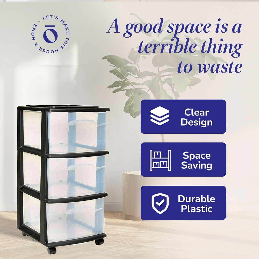Cart Masterpiece: Perfect the art of hiding your chaos with the HOMZ storage carts with drawers. This plastic drawer cart is made to fit anywhere you need organizing power, whether at home or work. For Small Spaces: This roomy plastic organizer measures 12.5" L x 14.25" W x 25.5" H with the interior of each drawer measuring 12.31" L x 9.92" W x 6.85" H. It Will Fit: Our rolling drawer organizer cart features clear plastic materials and removable wheels for easy transportation. Use them to store toiletries, office supplies, crafts, and more. From Trash to Treasure: Life in plastic is fantastic when the plastic is made from 90% recycled materials. We know the earth is important to you, so our cart is good for your items and the planet. HOMZ for Your Home: From organization to storage, we have the container that you are looking for. Allow us to make your house a HOMZ.
