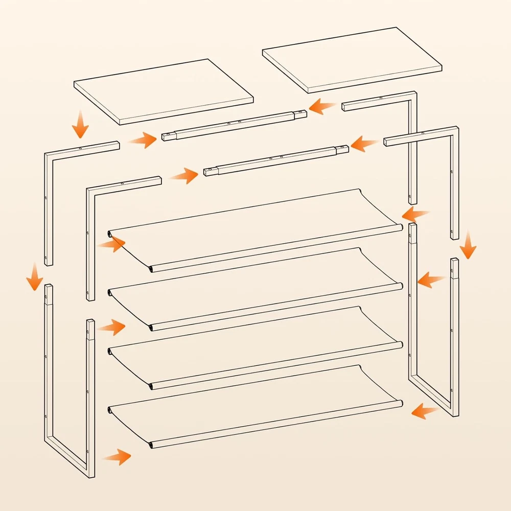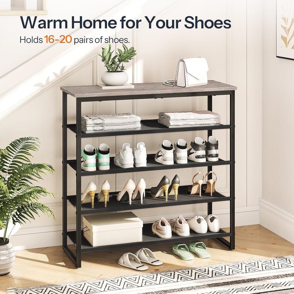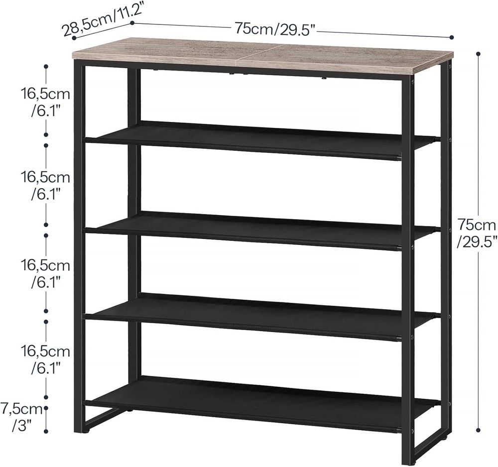 HOOBRO Shoe Rack, 5 29.5"L x 11.2"W x 29.5"H, Greige + Black Product Details Room Type: Entryway, Closet, Bedroom, Living Room, Mudroom Number of Shelves: 5 Special Feature: Adjustable Product Dimensions: 11.2"D x 29.5"W x 29.5"H Style: Industrial Age Range (Description): Adult,Kid Finish Type: Unfinished Brand: HOOBRO Size: 29.5"L x 11.2"W x 29.5"H Weight Limit: 22 Pounds Assembly Required: Yes Number of Items: 1 Manufacturer: HOOBRO Included Components: Hardware, Accessory Kit Model Name: Shoe Rack Item Weight: 5.5 Kilograms Furniture Finish: Unfinished Installation Type: Freestanding Weight capacity: Maximum weight: 22 Pounds Unit Count: 5.0 Count Product Name: Shoe Rack Item Weight: 12.1 pounds Item model number: BG50XJ01 Shoe Rack MaterialMounting Type: Engineered Wood, MetalFloor Mount Shelf TypeShape: Oxford FabricRectangular 5-Tier Shoe Rack: Shoes no longer need to be piled in the corridor, because you can put them neatly on this 5-tier shoe rack. By making full use of the space, you can clearly get your shoes Storage Helper: This shoe rack is 11.2"D x 29.5"W x 29.5"H in size, very suitable for entryway with limited space, living room, bedroom, closet, apartment and dormitory. Extending vertical space usage, this shoe rack can be a choice for saving space. It also can be a storage shelf. Unleash your creativity! Material and Structure: This shoe rack is made of durable waterproof oxford cloth, particleboard and thickened iron pipe, featuring easier clean. The top wooden shelf can be used to place albums, plants, handbags and other items, beautiful and practical Built to Last: The reasonable structural design enhances the stability of the shoe rack. Max load ability of the top is 22 lb with each shelf bearing up to 11 lb. 4 adjustable feet help keep balance at all times Easy Assembly: Easy to set up in just a few steps. With detailed instructions and clearly numbered parts, it does’ t take any time to assemble this shoe rack
