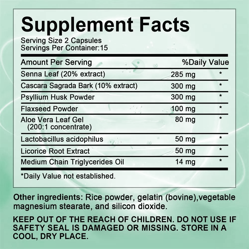 Number of Pills: 120 Capsules gtin13: Does not apply Shelf Life: 2 years Flavor: Unflavored Ingredients: Flaxseed, Psyllium Husk, Senna Leaf, Cascara Sag Expiration Date: 05/2027 Type: Supplement Main Purpose: Cleansing, Detox, Weight Loss, Bloating Relief Supply: 1 Month and Longer Features: All Natural, Easy to Swallow, Eco-Friendly Active Ingredients: Flaxseed, Psyllium Husk, Senna Leaf, Casc Type of Diet: Organic UPC: Does not apply Country of Origin: Unknown Formulation: Capsule Brand: SCOLA Dosage: 1179mg Storage: Keep in a cool,dry place and please sealing FDA Registration Number: 17764267154 Item Weight: 100g When to Take: After Meal Production Date: 04/2024 Department: Men, Unisex, Women