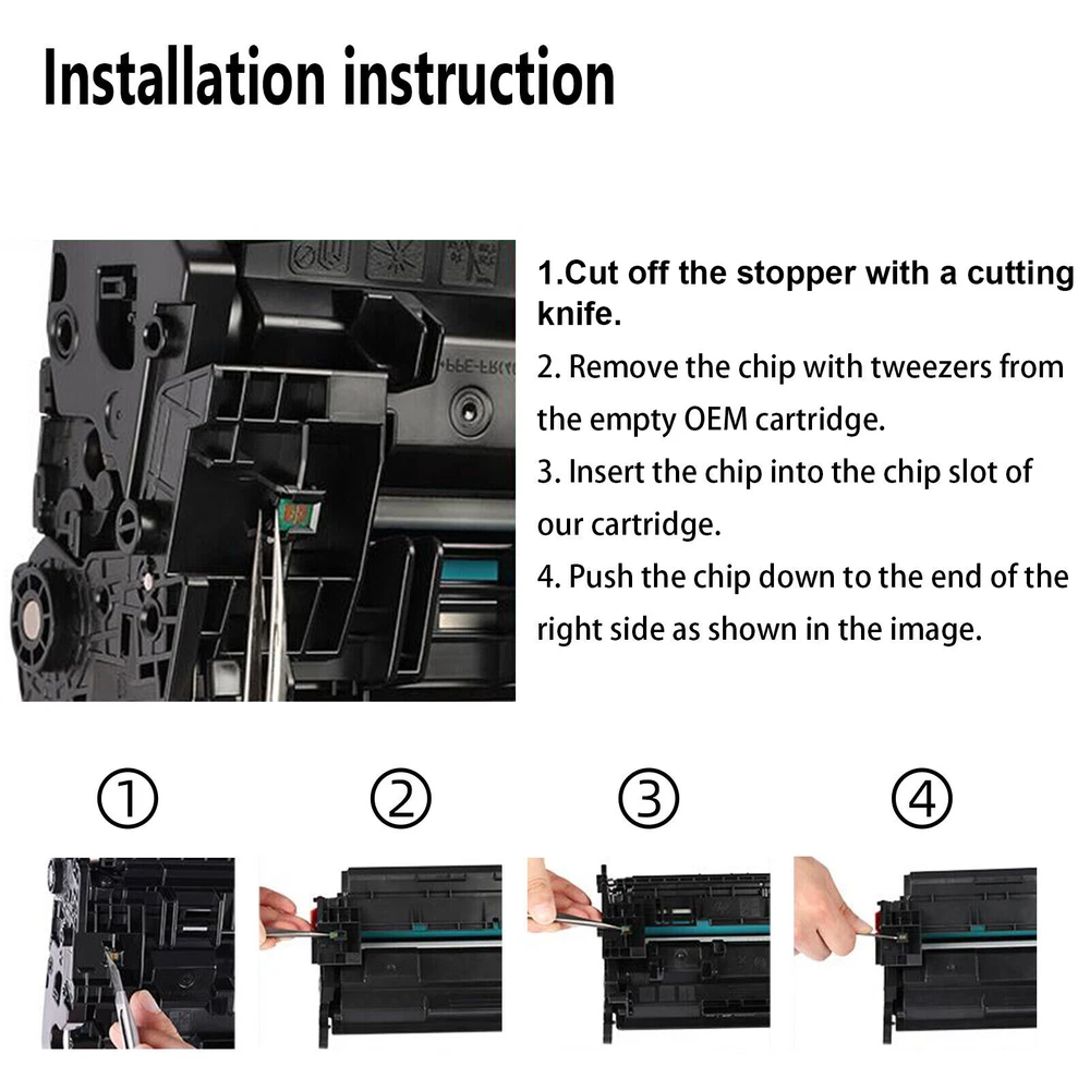 Condition: New It is certified with ISO 9001 and ISO 14001 Item:Premium Compatible with HP W1340A 134A Toner Cartridge Model:W1340A (NO Chip) Color:Black Shelf Life:3 Years Printed Pages:1,100 pages at 5% coverage (Actual toner yield varies with usage, graphics printed and environmental conditions.) Compatible printer list: HP LaserJet M209 HP LaserJet M209dwe HP LaserJet M209dw HP LaserJet MFP M234dw HP LaserJet MFP M234dwe HP LaserJet MFP M234sdne HP LaserJet MFP M234sdn HP LaserJet MFP M234sdwe HP LaserJet MFP M234sdw W1340A No Chip Toner Compatible with HP 134A LaserJet M209 dw M234 M234sdne LOT Model W1340A ( without chip ) Color Black Page Yield 1,100 pages at 5% Coverage (4A Paper) Warranty 1 Year Condition Brand New *Please make sure you still keep the chip of the original toner cartridge before purchasing our compatible product.Please install the original chips into out toner cartridges. Compatible with Printers Listed Below: HP LaserJet M209 HP LaserJet M209dwe HP LaserJet M209dw HP LaserJet MFP M234dw HP LaserJet MFP M234dwe HP LaserJet MFP M234sdne HP LaserJet MFP M234sdn HP LaserJet MFP M234sdwe HP LaserJet MFP M234sdw How to install the chip? 1.Cut off the stopper with a cutting knife. 2.Remove the chip with tweezers from the empty OEM cartridge. 3.Insert the chip into the chip slot of our cartridge. 4.Push the chip down to the end of the right side. Fast and Safe Shipping Reliability on the Move, Safety in Transportation. Print Effects Clear / Sharp / Vivid At Your Service Anytime Available to help you anytime. Please contact us through eBay messages.