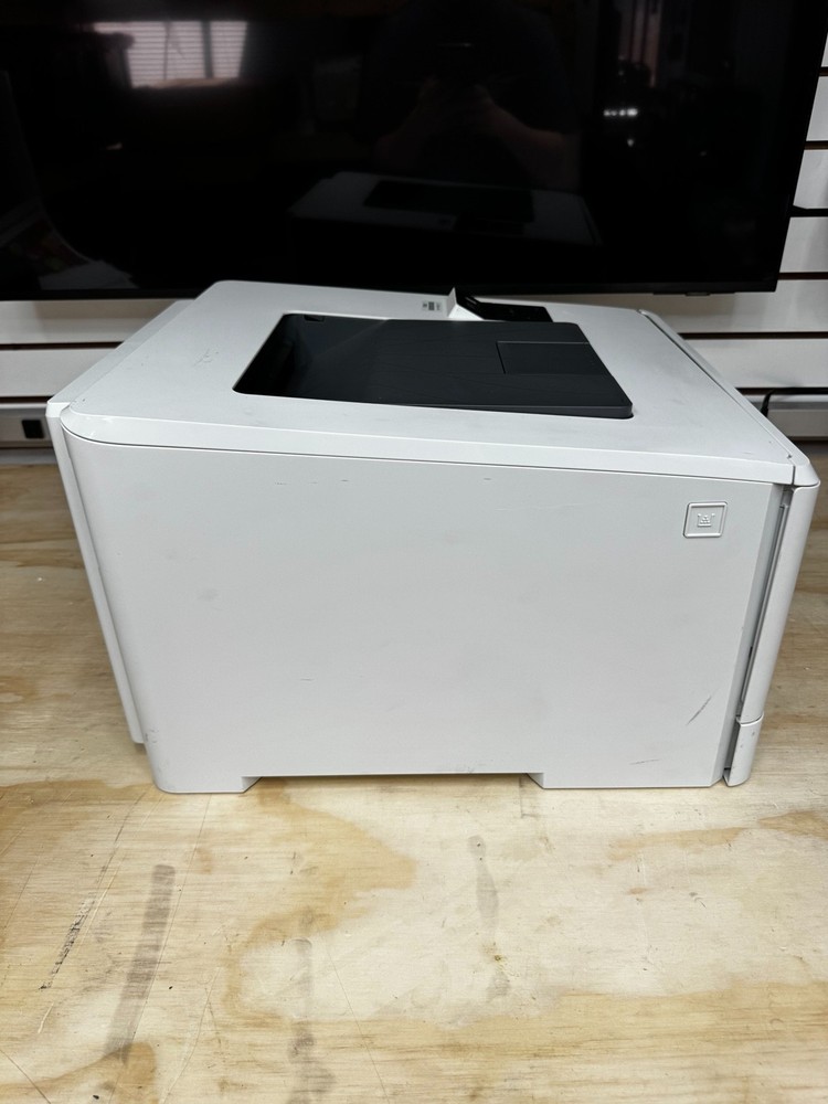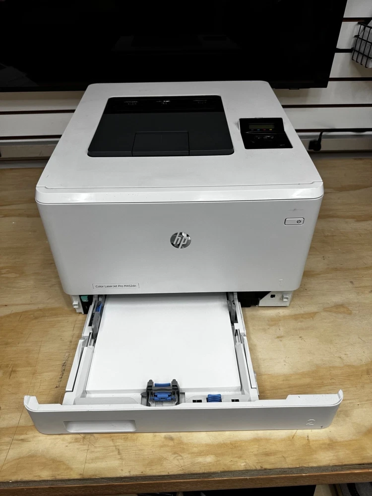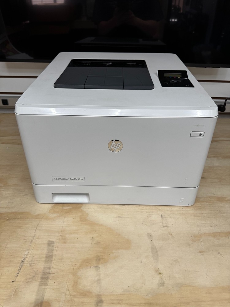 Up for sale is an HP Color LaserJet Pro M452dn printer in excellent working condition. This is a high-quality business-class color laser printer known for fast speeds, sharp prints, and reliability. The printer has been fully tested and prints great. All toner cartridges (Black, Cyan, Magenta, Yellow) show approximately 100% levels , making this an outstanding value. Key Features: Color Laser Printer (no ink drying issues) Automatic Duplex Printing (double-sided) Ethernet Network Connectivity Fast, high-quality color output Ideal for office or home business use Condition Details: Fully tested and working perfectly Clean overall with minor cosmetic scuffs from normal use No cracks or major damage See photos for exact condition Toner Status: Black: ~100% Cyan: ~100% Magenta: ~100% Yellow: ~100% (As shown in included status page) What’s Included: HP Color LaserJet Pro M452dn Printer Power Cable USB Cable Printed usage & supplies status pages Shipping: Ships within 1 business day Professionally packed to ensure safe delivery Local pickup optional (if applicable)