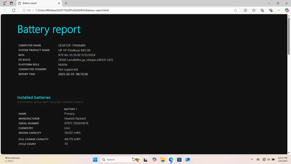 This business class laptop has a brand new 512GB NVME M.2 SSD Gen3x4|2280. The cosmetic is not perfect so check the photos carefully. The outer covers have some minor scratches/dents circled in red markups for easy indentation. The anti-glare/matte non-touchscreen has a light scuff on it circled in blue markup for easy identification. Notes: This laptop comes with Power Cord and AC Power Adapter. Latest Windows 11 Pro version 24H2 with all updates including BIOS, Firmware and Driver(s) installed ready to be use right out of the box. Battery Report: Design Capacity: 50,012 mWh Full Charge Capacity: 44,179 mWh Cycle Count: 70 out of 500 charge life cycle Battery Manufacture Date: 04/10/2020 Laptop Born Date: 11/20/2019 The HP EliteBook 840 G6 7KK13UT specifications include: Processor: Intel Core i5-8265U (8th Gen) CPU @ 1.60GHz 1800 Mhz 4 Core(s), 8 Logical Processor(s) Graphics: Intel UHD Graphics 620 Display: 14.0”, Full HD (1920 x 1080) - Anti-Glare/Matte Non-TouchScreen Storage: Brand New 512 GB SSD NVME M.2 Gen3x4|2280 Memory: 16GB DDR4, 2400 MHz Keyboard: BackLite Keyboard Software (OS): Windows 11 Pro 24H2 Weight: 1.48 kg (3.3 lbs)
