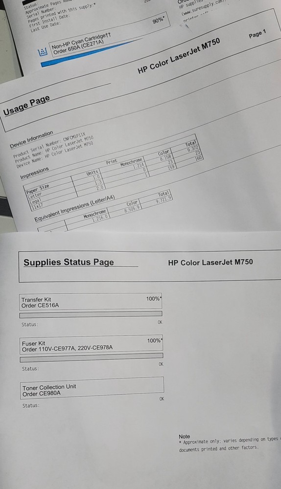 HP LaserJet Enterprise M750dn Duplex Color Laser Printer D3L09A PgCount 9K+ PgCount is 9K+, TONER NOT INCLUDED. Fully tested, detailed in/out and tested to work like new. Comes with a power cord only. However, toner, CD or manual are not included. Ships to the lower 48 states only I'M AVAILABLE FOR QUESTIONS 24/7. For Hawaii, Alaska or Puerto Rico, GUAM, APO, FPO and for international buyers, please contact me for the correct shipping quotes. NO PO BOXes Most orders are shipped same or next day within the continental USA. Wtih many years of selling and shipping printers behind us, all orders are securely packed to avoid damages in transit. We will ship to Paypal-confirmed address only. No PO Boxes We will only ship to 48 continental US states. International shipping, AK, HI and PR incur extra shipping charges, please contact us before placing an order. Products operating system compatibility is the buyer's responsibility. Please check to make sure before placing orders. Shipping, handling and return shipping fees are non-refundable, on a free-shipping item, cost of initial shipping will be deducted. Refunds are issued only after products are received in the same condition. All items are used, unless otherwise stated. We try our best to describe items, If you have any questions, feel free to ask prior to bidding, buying or leaving a negative/neutral feedback. Buyer is responsible for international customs fees or any other fees associated with clearing their orders. No Returns or exchange on international orders. I am into liquidation sales, all of our machines are from smoke-free homes and offices. I will do my best to match any price. Any reasonable offer will be considered on any item. Customer satisfaction is #1 priority. I stand behind my merchandise and its functionality by any means necessary. I do my best to ensure that all my buyers are completely satisfied with their transaction & walk away with fondness of the great experience on their minds after all said and done. Please remember the best way to solve any problem that may arise during any transaction is communication. So please do not hesitate to contact me either by email or by phone so that together we can complete the transaction as smooth as possible. We are available 24/7 and we reply messages ASAP Pictures sell! Auctiva offers Free Image Hosting and Editing. 300+ Listing Templates! Auctiva gets you noticed! The complete eBay Selling Solution. Track Page Views With Auctiva's Counter