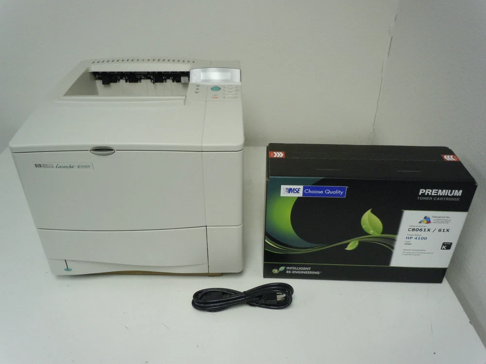 HP LaserJet 4100N Printer with New Compatible HP 61X High Yield Toner Cartridge & Warranty BOX CONTENTS: 1 x HP Laserjet 4100n Printer (10/100tx HP Jetdirect Network / Parallel IEEE 1284 Connectivity) 1 x New Compatible HP 61X (C8061X) High Yield Toner Cartridge (10,000 Page Yield) 1 x New 6' Power Cord * Software and manuals not included but can be found at the HP website. TECHNICAL SUPPORT: * We offer free tech support. Contact us anytime for any reason, we are happy to help. SHIPPING: * Free FedEx ground shipping to any home or business address (lower 48 states only) * Ships fast within one business day or less * Ships in brand new "double wall" box for maximum safety in transit * Free local pick up from our retail location in Garden Grove, Ca. 92841 OFFICE HOURS: * Open 9am / Close 5pm (Monday - Friday). Closed Saturday and Sunday. QUESTIONS: * Please email with any questions, we are quick to reply.