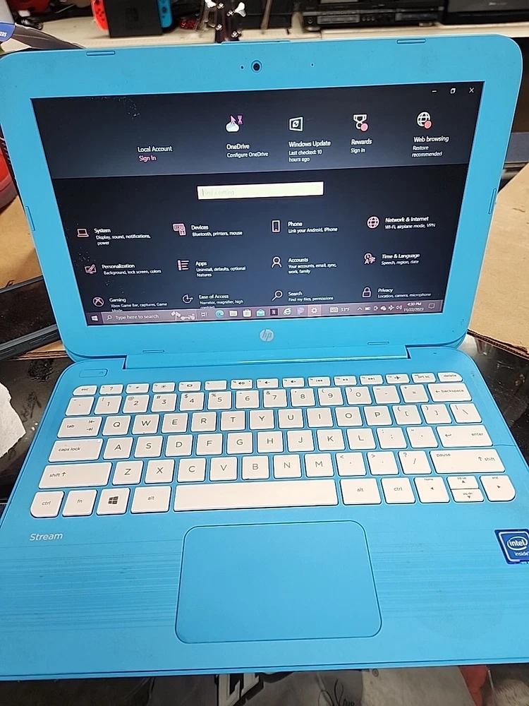This HP Stream Blue Laptop is the perfect device for your computing needs. With an 11-inch screen size and Intel Celeron processor speed of 1.60 GHz, it is perfect for on-the-go use. The device comes with 4 GB of RAM and a hard drive capacity of 27.8 GB, providing ample space for all your files and applications. The laptop runs on Windows 10 Home and is perfect for both personal and professional use. Its sleek blue color adds a touch of style to your use. Won't let me reset. Not enough memory. So selling for parts only.