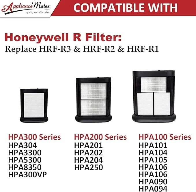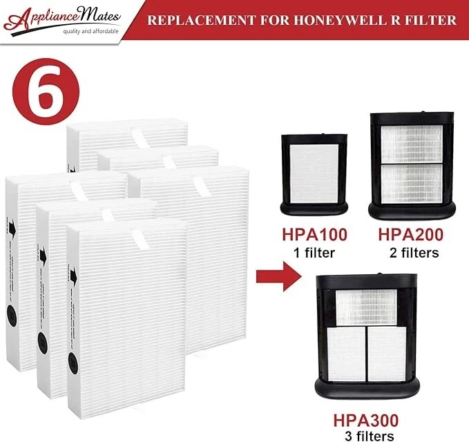 [R Filter for Honeywell Air Purifier]: 6 pack HEPA filter R are compatible with Honeywell air purifier hpa 300/200/100 series. The dimension of this type r hepa filter is: 10.2” x 6.5” x 1.6” [Compatible with Honeywell HPA]: R filters for honeywell air purifier, compared to part # HRF-R3, HRF-R2 and HRF-R1. Compatible with Honeywell HPA300, HPA200, HPA100 series air purifier console models: HPA090, HPA094, HPA100, HPA101, HPA104, HPA105, HA106, HPA200, HPA201, HA202, HPA204, HPA250, HA300, HPA300, HPA300VP, HPA304, HPA3300, HPA5300 & HPA8350 [Powerful & Efficient Filtration]: Regular replacement of hpa300 hepa filter replacement will help your Honeywell HPA300 HEPA air purifier maintain 99.97% filtration efficiency, resulting in cleaner and fresher air. Our hpa300 hepa filter replacement are perfect for homes with pets, and those who value air quality [Why Choose Us]: APPLIANCEMATES replacement filters for Honeywell HPA300, are made of quality non-woven fabric HEPA 13 / MERV 17 material, and constructed to the highest standards to reduce air resistance and improve airflow. Don't forget to replace the filters for your air purifier hpa300/200/100. As a result, regularly putting a fresh new filter in place can keep your air purifier running at its optimal state [AFTER-SALES SERVICE]: You will receive not only pack of 6 honeywell's r hepa filter but also 100 satisfaction guarantee. Any questions, you can contact us, we will try our best to give you a satisfactory solution