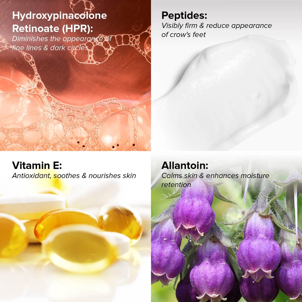 Target Multiple Signs of Aging: This revolutionary product dramatically improves fine lines, wrinkles, and aging signs. Its unique formula featuring Hydroxypinacolone Retinoate (HPR) renews the delicate under-eye area. Maximum Results, Minimal Irritation: The key ingredient is Hydroxypinacolone Retinoate (HPR), a new retinoid powerful enough to visibly brighten and intensively hydrate all while being gentle of the skin. HPR has shown to potentially outperform traditional retinol eye cream! Under Eye Cream for Dark Circles: This lightweight and hydrating, non-greasy texture eye cream not only fights wrinkles but also reduces dark circles and puffiness for a refreshed look. Gold-Standard Ingredients: In addition to HPR, the eye cream also combines a potent blend of peptides, allantoin & E to moisturize and create supple, soft skin. Safe for All Skin Types: The under eye cream is both highly effective and gentle enough for sensitive skin. Clean Formula Made in the USA: Our under eye brightener is cruelty free and was formulated with you in mind right here in the USA!