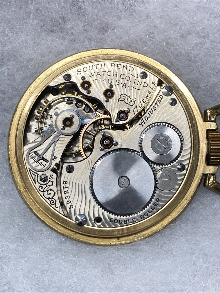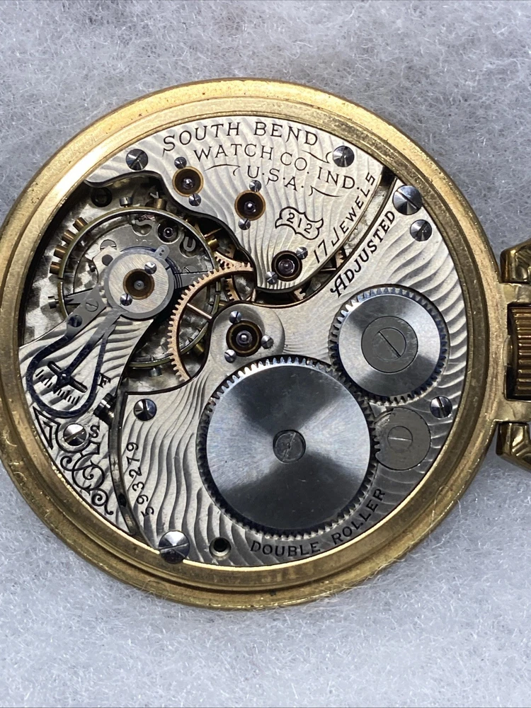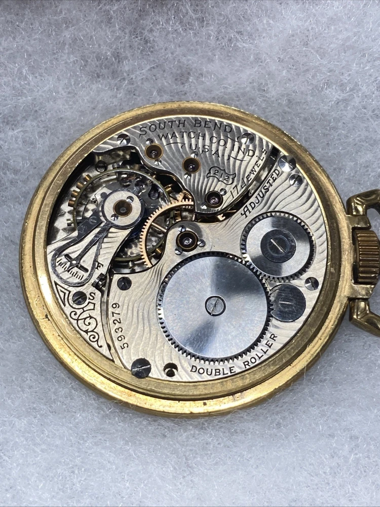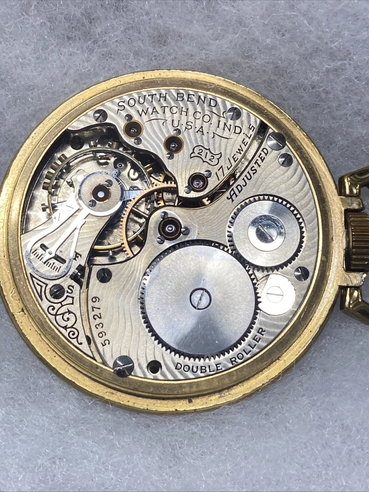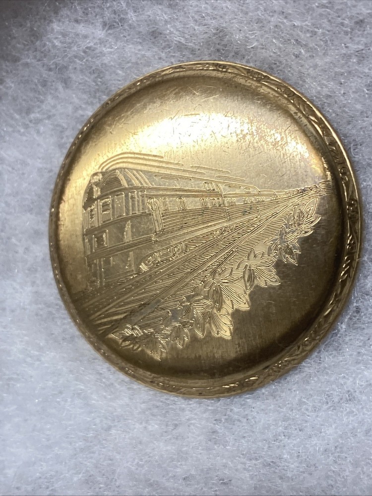 The product is a rare 1909 South Bend Model 2 Grade 212 16s 17J pocket watch with a train-themed case. This vintage timepiece features a mechanical manual movement, numerals on the dial, and a gold toned case with a polished finish. The open face closure and lever escapement type add to its unique charm. This pocket watch is a highly sought-after collectible for watch enthusiasts and collectors, especially those with a passion for antique timepieces. Selling only as parts/repair untested condition. Item doesn’t function have no knowledge on item testing or repair. Please review all images prior to your purchase. Crystal is damaged as shown.