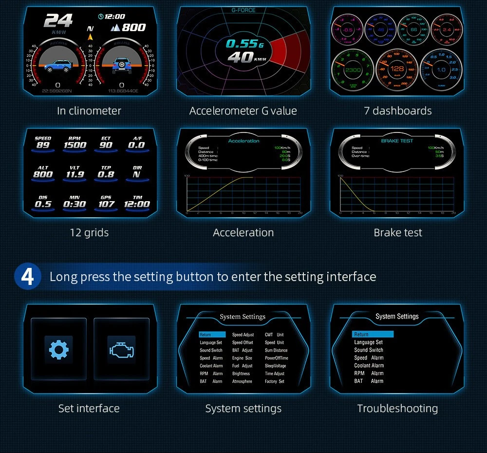 Details Head Up Display Dual System Digtial Water Oil Temp Turbo Press lnclinometer HUD OBD2 Car Accessory On-board Computer Add our listing to Watchlist Or Add to Cart , you will get more discount Functions: vehicle speed, voltage, water temperature, oil temperature, transmission oil temperature, turbo pressure, instantaneous fuel consumption, average fuel consumption, exhaust temperature, fuel quantity, driving distance, travel time, altitude, number of satellites, rotational speed, GPS vehicle speed, intake air temperature, Oil pressure, fuel pressure, GPS accuracy, date, day of the week, time, accelerometer, latitude, barometric pressure, longitude, driving direction, engine load, outside temperature, power battery level, left and right inclination, front and rear pitch Feature: 1.OBD2+GPS+Incline meter, universal cars 2. With 12 interfaces + 10 alarm functions 3. Automatic photosensitive + automatic switching of ambient light 4. The response is smooth Package includes: 1 X HUD 1 X Mount 1 X OBD Cable 1 X Anti Slip Mat 1 X Manual
