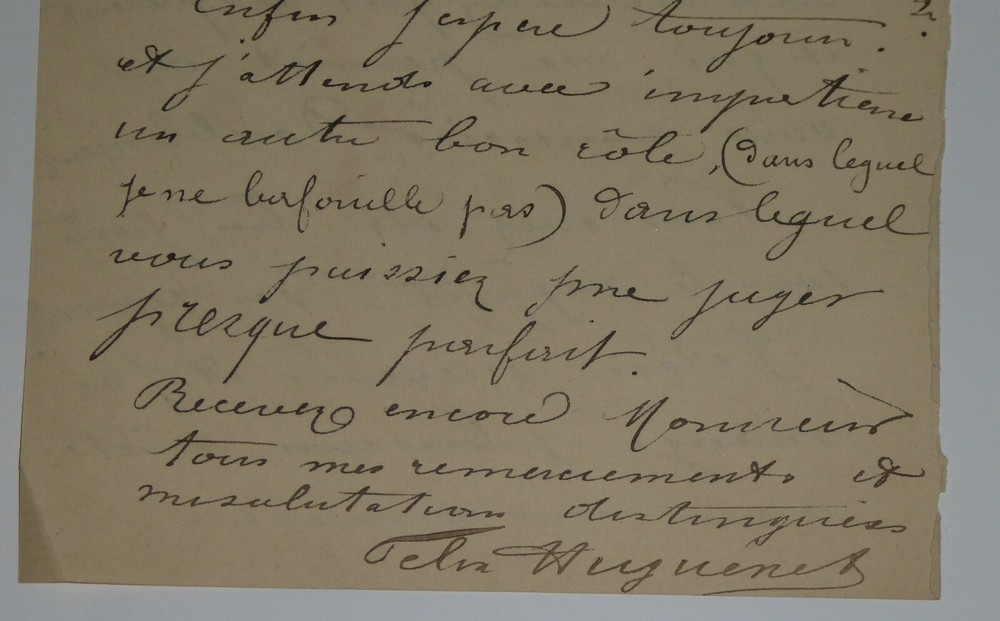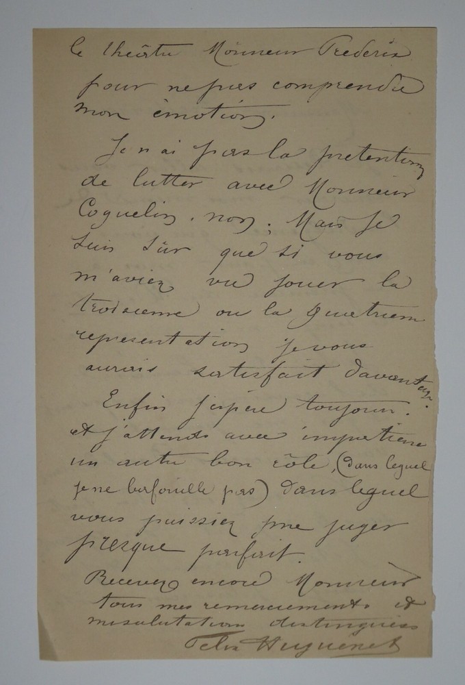 Félix HUGUENET. Lettre autographe signée et datée du 22 décembre 1884. Lettre en deux pages adressée à Alfred Frédérix afin de le remercier pour son "indulgence" à la première de la pièce Le Député . Il lui fait remarquer qu'il a été un peu strict concernant les reproches faits à son égard et précise qu'il était très nerveux et que, par conséquent, il a "mangé" plusieurs mots mais "que vous connaissez trop le théâtre, Monsieur Frédérix, pour ne pas comprendre mon émotion." Il ajoute qu'il fera attention à l'avenir et attend un rôle qui ne le fera pas "bafouiller" et dans lequel son correspondant pourra le juger parfait. Dimensions : 11.5 x 18 cm. 2 pages. Etat : Relativement bon état de conservation. Félix Huguenet (né le 10 mai 1858 à Lyon et mort le 18 novembre 1926 à Antibes ) est un acteur français . Envoi soigné dans un emballage rigide et étanche. Satisfait ou remboursé. Si vous n'êtes pas entièrement satisfait, je reprends la marchandise avec retour à ma charge pour l'Europe et à la charge de l'acheteur pour le reste du monde. N’hésitez pas à visiter ma boutique et affiner vos recherches en fonction des catégories qui vous intéressent. Ma boutique L'Art Délivré. Lettres autographes, vieux papiers, livres anciens, photographies, gravures, timbres… Nous expertisons et/ou rachetons dans toute la France vos lettres, collections de lettres et livres anciens. Merci de votre visite. Jérôme KAYSER. Lettre en deux pages adressée à Alfred Frédérix afin de le remercier pour son "indulgence" à la première de la pièce Le Député . Il lui fait remarquer qu'il a été un peu strict concernant les reproches faits à son égard et précise qu'il était très nerveux et que, par conséquent, il a "mangé" plusieurs mots mais "que vous connaissez trop le théâtre, Monsieur Frédérix, pour ne pas comprendre mon émotion." Il ajoute qu'il fera attention à l'avenir et attend un rôle qui ne le fera pas "bafouiller" et dans lequel son correspondant pourra le juger parfait. Satisfait ou remboursé. Si vous n'êtes pas entièrement satisfait, je reprends la marchandise avec retour à ma charge pour l'Europe et à la charge de l'acheteur pour le reste du monde. N’hésitez pas à visiter ma boutique et affiner vos recherch