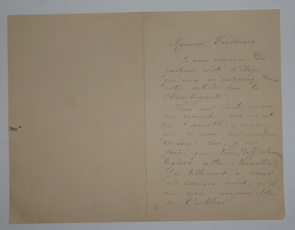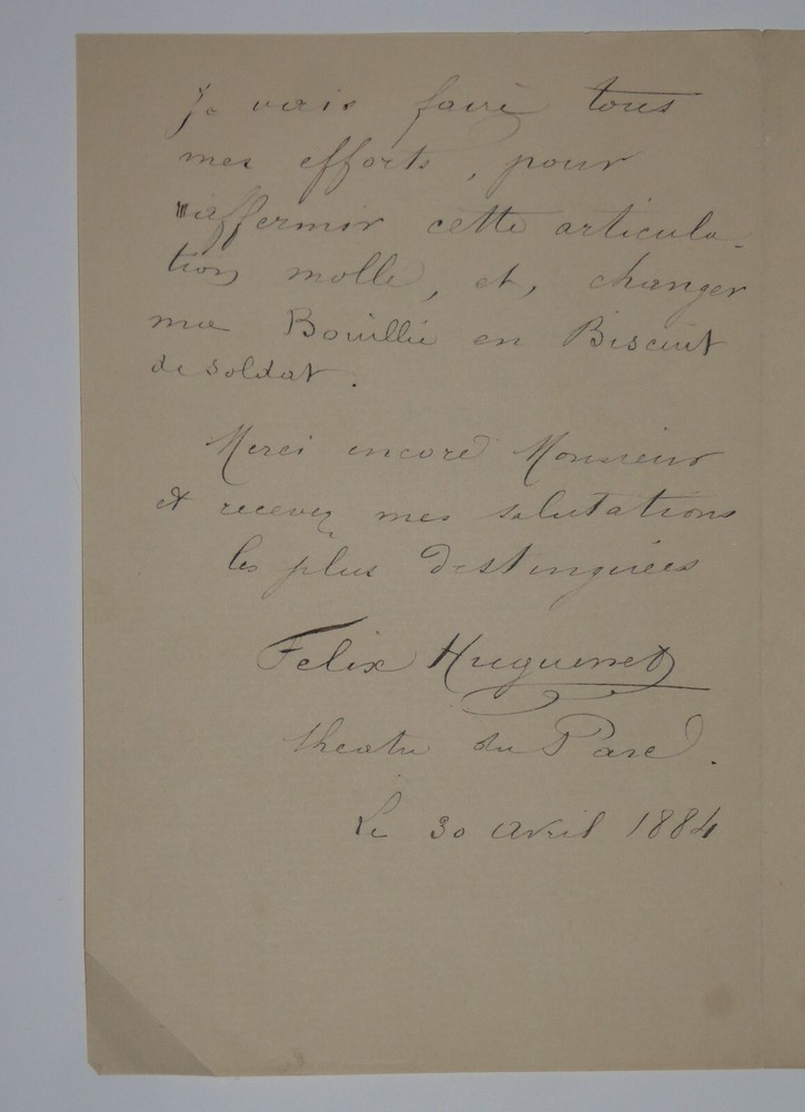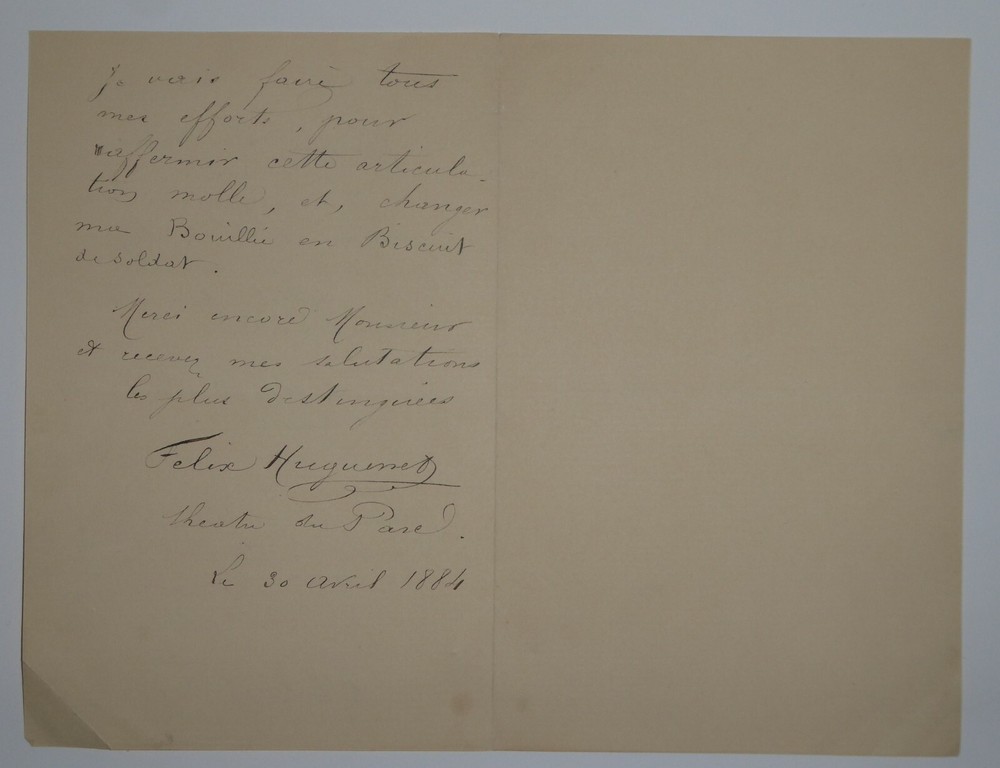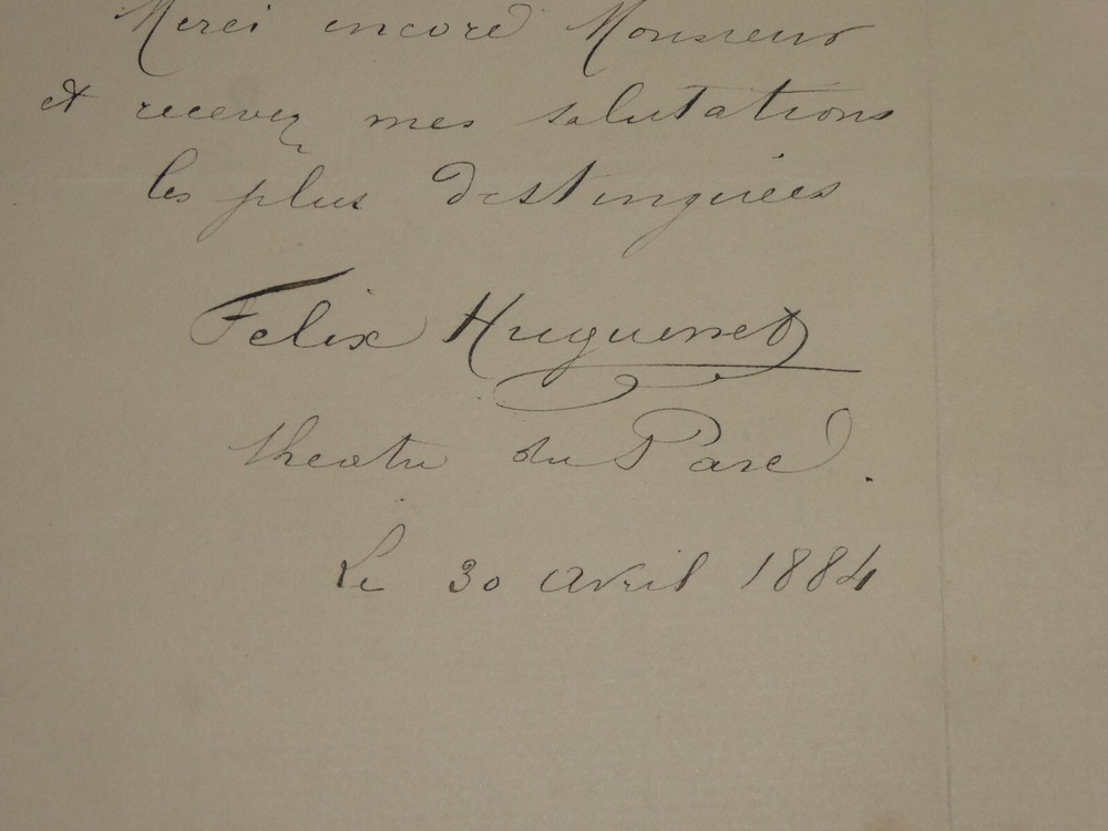 Félix HUGUENET. Lettre autographe signée et datée du 30 avril 1884. Lettre en deux pages adressée à Alfred Frédérix afin de le remercier pour un récent article le concernant, bien qu'il n'ait pas apprécié un reproche qui lui a été fait : en effet, il explique le reproche lui a été sensible mais qu'il lui rend service car il peut apprendre de ses défauts. On lui aurait reproché son articulation des mots et l'aurait comparé à de la bouillie : "je vais faire tous mes efforts pour raffermir cette articulation molle et changer ma bouillie en biscuit de soldat". Dimensions : 10.7 x 16.5 cm. 2 pages. Etat : Relativement bon état de conservation. Félix Huguenet (né le 10 mai 1858 à Lyon et mort le 18 novembre 1926 à Antibes ) est un acteur français . Envoi soigné dans un emballage rigide et étanche. Satisfait ou remboursé. Si vous n'êtes pas entièrement satisfait, je reprends la marchandise avec retour à ma charge pour l'Europe et à la charge de l'acheteur pour le reste du monde. N’hésitez pas à visiter ma boutique et affiner vos recherches en fonction des catégories qui vous intéressent. Ma boutique L'Art Délivré. Lettres autographes, vieux papiers, livres anciens, photographies, gravures, timbres… Nous expertisons et/ou rachetons dans toute la France vos lettres, collections de lettres et livres anciens. Merci de votre visite. Jérôme KAYSER. Lettre en deux pages adressée à Alfred Frédérix afin de le remercier pour un récent article le concernant, bien qu'il n'ait pas apprécié un reproche qui lui a été fait : en effet, il explique le reproche lui a été sensible mais qu'il lui rend service car il peut apprendre de ses défauts. On lui aurait reproché son articulation des mots et l'aurait comparé à de la bouillie : "je vais faire tous mes efforts pour raffermir cette articulation molle et changer ma bouillie en biscuit de soldat". Satisfait ou remboursé. Si vous n'êtes pas entièrement satisfait, je reprends la marchandise avec retour à ma charge pour l'Europe et à la charge de l'acheteur pour le reste du monde. N’hésitez pas à visiter ma boutique et affiner vos recherches en fonction des catégories qui vous intéressent. Ma boutiqu