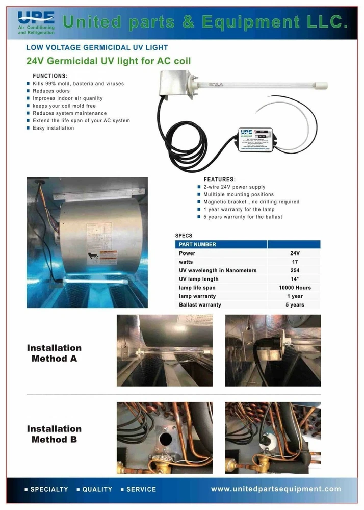 Filter Life:12 MonthsModel:GUV-2414Contaminants Captured:Bacteria, Dust, Dust MitesBrand:TuttokoolMPN:Does Not ApplyCountry/Region of Manufacture:ChinaType:HVAC AIR HANDLERApplication:Whole HouseVoltage:24 VColor:Gray