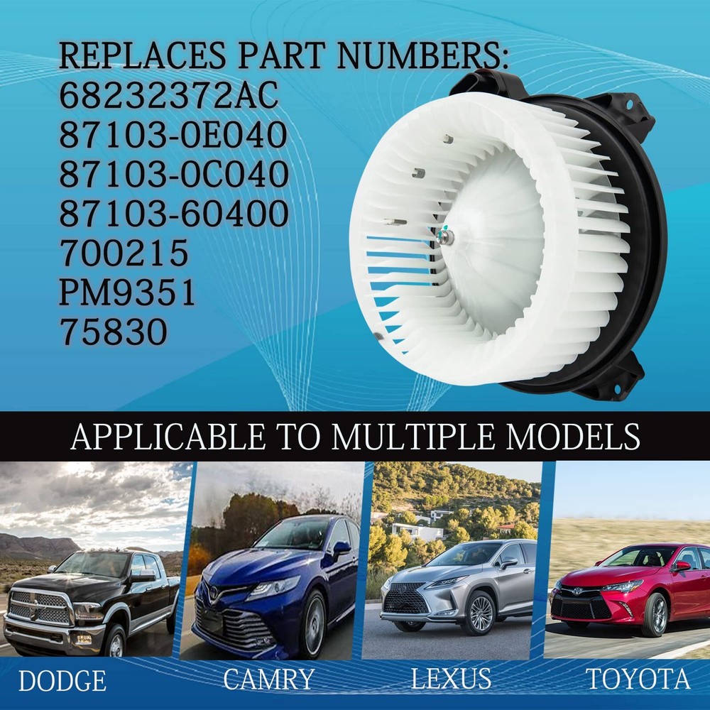 【Fitment information】:Compatible with 2014-2020 Dodge Journey | 2013 Lexus ES300h 2007-2018 ES350 2010-2019 GX460 2010-2012 RX350 RX450h | 2010-2020 Toyota 4Runner 2005-2018 Avalon 2007-2017 Camry 2008-2019 Highlander 2007-2020 Tundra 2010-2016 Venza. 【 Blower Motor Features】:The blower resistor is also the blower control module, which is usually located near the air conditioning filter and blower motor, and it regulates the air speed of the blower motor by varying the resistance and current. If your blower isn't working or is only running through one speed, then replacing our resistor can solve the problem! 【Compatible Part Numbers】:Replacement for Blower Motor OE Number:700215 PM9351 68232372AC 87103-0E040 87103-0C040 87103-60400 75830. Product Description For Toyota Models 2010-2020 Toyota 4Runner 2005-2018 Toyota Avalon 2007-2017 Toyota Camry 2008-2019 Toyota Highlander 2007-2020 Toyota Tundra 2010-2016 Toyota Venza For Lexus Models 2013 Lexus ES300h 2007-2018 Lexus ES350 2007-2018 Lexus ES350 2010-2012 Lexus RX350 2010-2012 Lexus RX450h Replaces Part Numbers 68232372AC 87103-0E040 87103-0C040 87103-60400 700215 PM9351 75830 Wind power strong and no noise Quickly restore fresh air Material of rotor punching plate is silicon steel sheet Enameled wire is used copper enameled wire Durable and stable performance Impact resistance Heat resistance Aging resistance