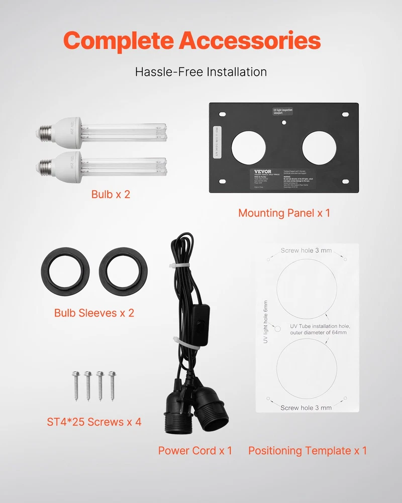 HVAC Air Purifier Whole House 50W 5inch UV Light in Duct for Ac Systems HVAC Air Purifier Whole House 50W 5inch UV Light in Duct for Ac SystemsEfficient Air PurificationReliable and Durable QualityEasy to Use and MaintainWide ApplicationStrong CompatibilityScentless PurifierPower Cord Length: 4.92 ft / 1.5 m,Housing Dimensions: 7.09 x 4.33 x 0.06 Inches / 180 x 110 x 1.5 mm,Bulb Quantity: 2,Color: Black,Item Model Number: 2403-UV25X2,Switch Dimensions: 2.23 x 1.02 x 0.53 Inches / 60 x 26 x 13.5 mm,Rated Power: 50W (25W per bulb),Product Dimensions: 7.09 x 4.33 x 9.84 Inches / 180 x 110 x 250 mm,Net Weight: 1.3 lbs / 0.59 kg,Wavelength: 254nm,Bulb Length: 5 Inches / 126 mm,Main Material: SteelSpecifications:- Length: 41.0 in, Width: 12.5 in, Height: 7.0 in HVAC Air Purifier Whole House 50W 5inch UV Light in Duct for Ac Systems HVAC Air Purifier Whole House 50W 5inch UV Light in Duct for Ac Systems Efficient Air Purification Reliable and Durable Quality Easy to Use and Maintain Wide Application Strong Compatibility Scentless Purifier Power Cord Length: 4.92 ft / 1.5 m,Housing Dimensions: 7.09 x 4.33 x 0.06 Inches / 180 x 110 x 1.5 mm,Bulb Quantity: 2,Color: Black,Item Model Number: 2403-UV25X2,Switch Dimensions: 2.23 x 1.02 x 0.53 Inches / 60 x 26 x 13.5 mm,Rated Power: 50W (25W per bulb),Product Dimensions: 7.09 x 4.33 x 9.84 Inches / 180 x 110 x 250 mm,Net Weight: 1.3 lbs / 0.59 kg,Wavelength: 254nm,Bulb Length: 5 Inches / 126 mm,Main Material: Steel Specifications: - Length: 41.0 in, Width: 12.5 in, Height: 7.0 in × × × × × × × × × × × × × × × × × × × × × Contact To contact our Customer Service Team, simply click the button here and our Customer Service team will be happy to assist. Ask seller a question Available 365 days a year 4:00am-7:00pm PST: Response within 2 hours 7:00pm-4:00am PST: Response after 4am Shipping The expected delivery date is sent to the buyer as soon as possible for their purchase order. Subject to exceptions, most items will be shipped out within three business days from our local warehouse. The majority of our products may be sent to any address for free using one of our many delivery options. The additional payment could be based on the package's weight and the location. Our items are stored in various warehouses. Your item will be shipped from the location nearest to your delivery address to ensure timely arrival. In rare cases, the item might be shipped from a different location due to stock levels. Sorry, but we do not currently offer local pickups. When our shipping partner has assigned a tracking number, we will provide it to you. Get in touch with us if your item hasn't arrived after 7 business days, and we'll do our best to help you track it down and make things right. The item price does not include import tariffs, taxes, or costs for international orders. The purchaser is liable for these expenses. We are always working hard to ensure your package arrives as soon as possible. Please understand that some factors like weather, high postal traffic, and the performance of shipping companies are outside of our control. Shipping is FREE for this item Payment Accepted Payment Methods Immediate payment is required upon selecting "Buy It Now" or upon checking out through the cart. We accept payment via U.S. PayPal accounts and all Major Credit Cards, Debit Cards & Google Pay. We are legally required to collect sales tax in those states and localities where we maintain a physical presence (nexus). The applicable amount of sales tax charged to an order will be calculated based on the shipment destination's state and local sales tax laws. Thank you for shopping with us on eBay! Returns Returns are accepted Items must be returned within 30 days of the auction ending Buyer will pay for return shipping. Returns, Damaged items & Missing items / Refund If the item is damaged, defective, we will cover the cost of return postage. You have 7 days from the date of receipt to provide a photo or video demonstrating the situation. It is important to inform us in advance if you have a change of heart about an item or if the buyer wishes to return it for any reason, including price. You will get return instructions with your buyer's delivery confirmation. In such instances, the purchaser must cover the cost of return shipping, and we should retain the original packing. There is a 30-day return policy from the date of purchase. You can return any item as long as it is unused and in the original packaging. After our scan and examination, you may expect to get your refund no later than three business days. Our inspection's findings will determine the amount of the refund that can be deducted. Canceled Orders / Refused Shipments Please let us know right away if you need to cancel your order after you've submitted it. Though we will try our best to prevent the order from going out by canceling it, we cannot promise that this will be feasible. The shipping cost will not be returned if you refuse delivery of your order. Additionally, there is a 20% restocking fee for the items. You might also like VEVOR Heated Mattress Pad 39x75 in Electric Warmer Coral Fleece with Auto Off Electric Heated Mattress Pad, 60x80 Queen Size Coral Fleece, safe Off, Fast Heat VEVOR Heated Mattress Pad 54x75 in Full Electric Warmer Coral Fleece Auto Off VEVOR Heated Mattress Pad 78x80 in King Electric Warmer Coral Fleece Auto Off eBay integration by